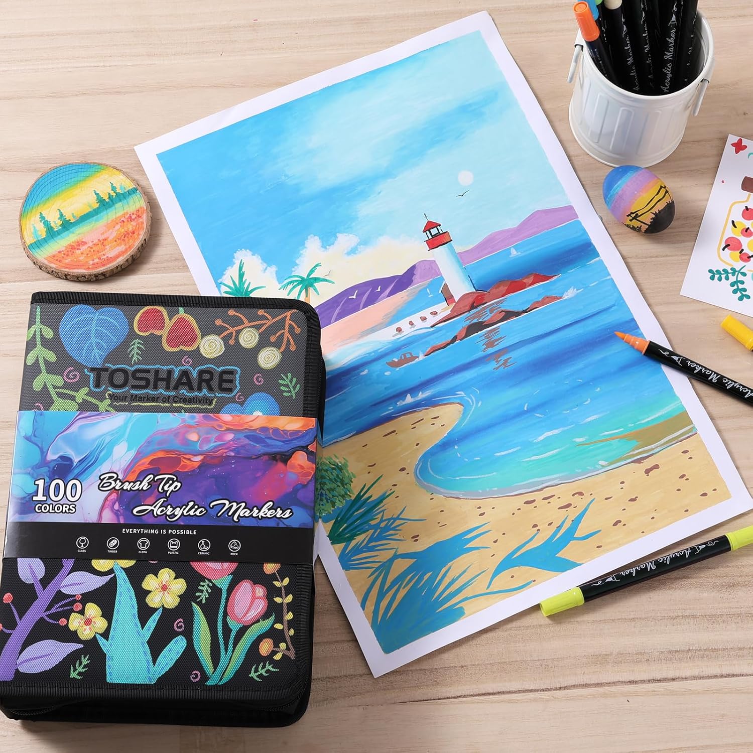 Acrylic Paint Pens Markers, 100 Colors Dual Tip Acrylic Paint Pens with Brush Tip and Fine Tip, Waterproof Markers for Rock Painting, Wood, Canvas, Stone, Glass, Ceramic,DIY Crafts Making Art Supplies