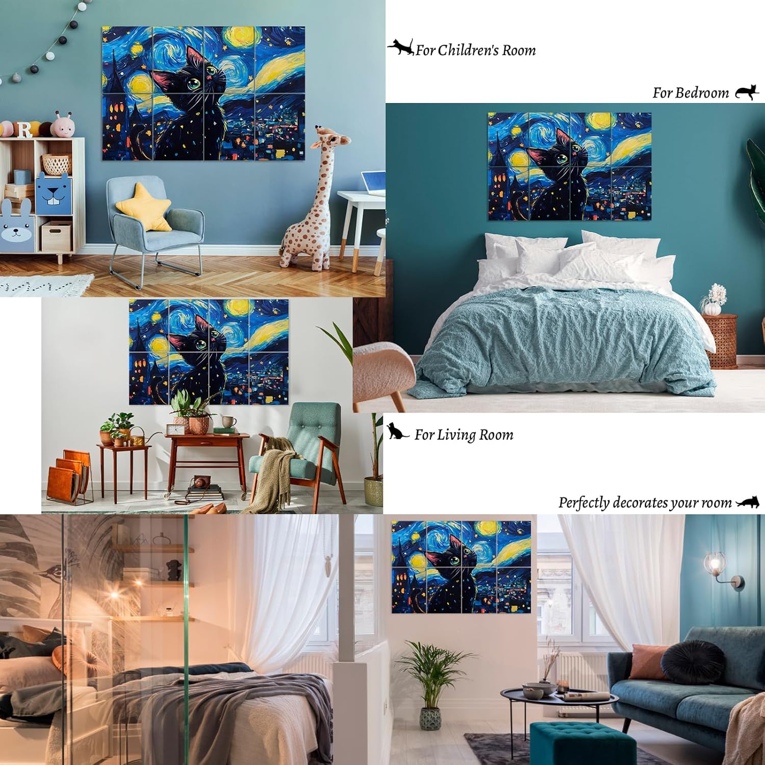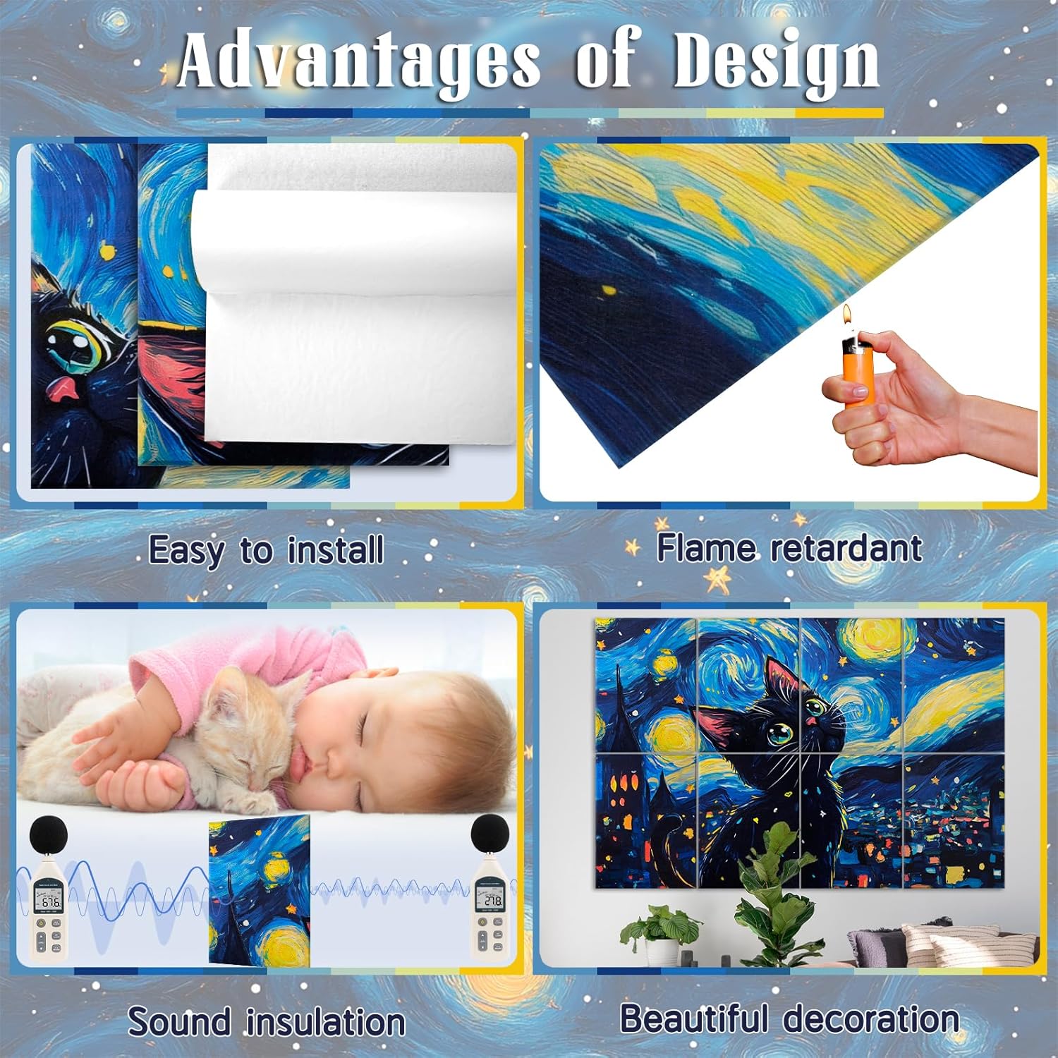 - 🐱【Fashion Wall Decoration】: Inspired by Van Gogh's starry skies, this soundproof panel features peaceful village underneath swirling and curling nebulae, with a lively kitten gazing curiously at the changing sky. The whole image is dreamy and warm, it's great to use as home decor.