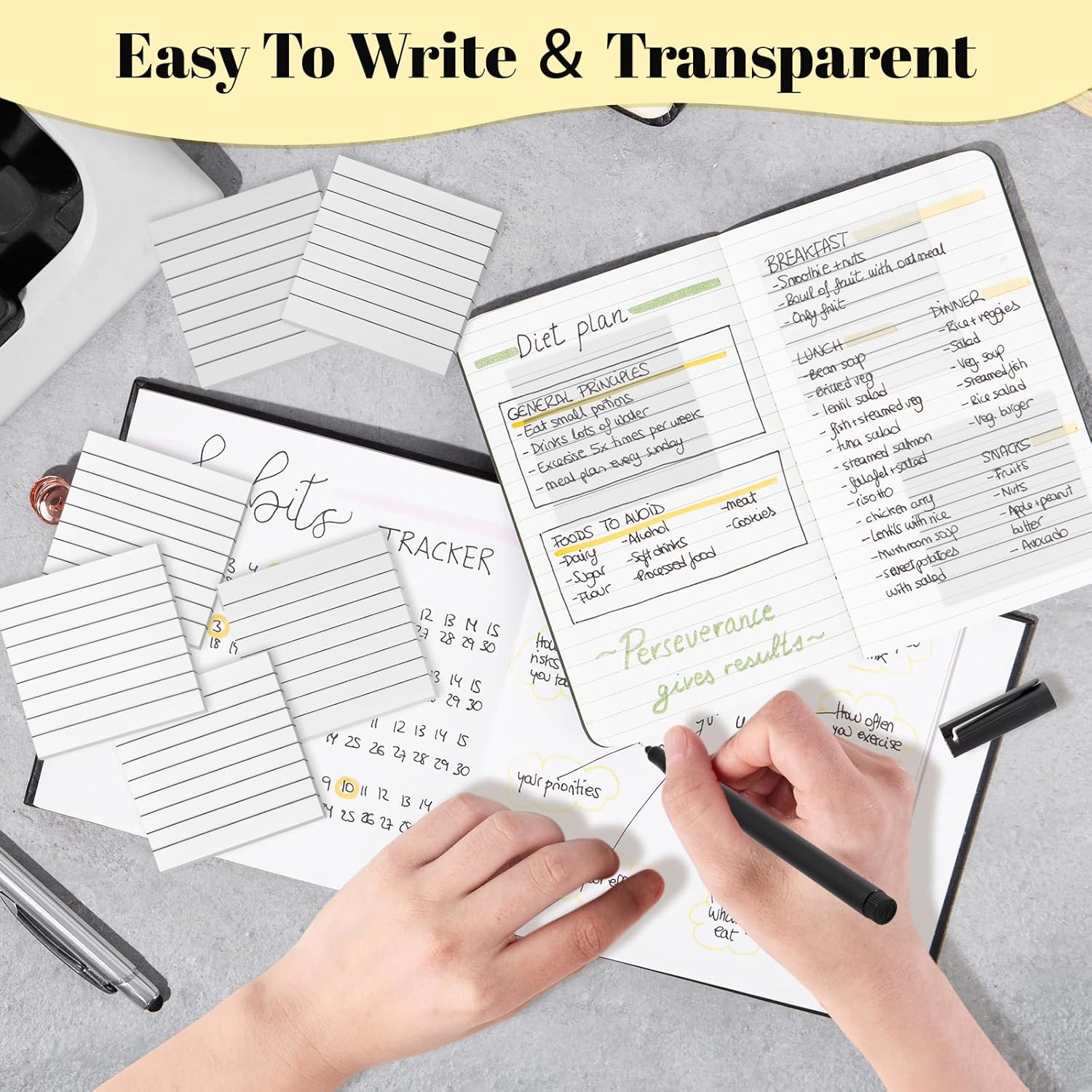 - Guided Writing & Versatile Use: These transparent sticky notes feature subtle black lines (3x3 inch) to help maintain neat handwriting. Ideal for annotating books, planners, journals, and digital screens without blocking underlying text. Includes 300 sheets (6 pads) for long-term use.