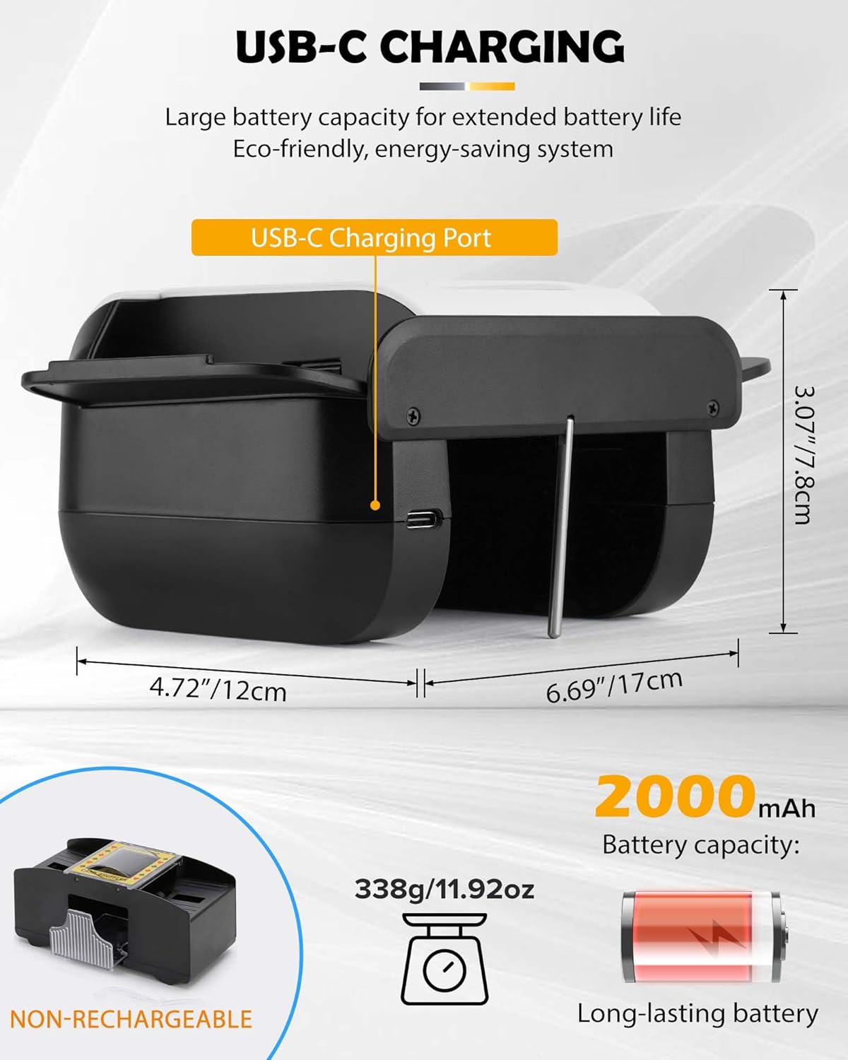 - RECHARGEABLE & PORTABLE : Equipped with a long-lasting 2000mAh rechargeable battery, this card shuffler eliminates the need for constant battery replacements. Its compact, portable design ensures you can take it with you to game nights, tournaments, or wherever you want to play