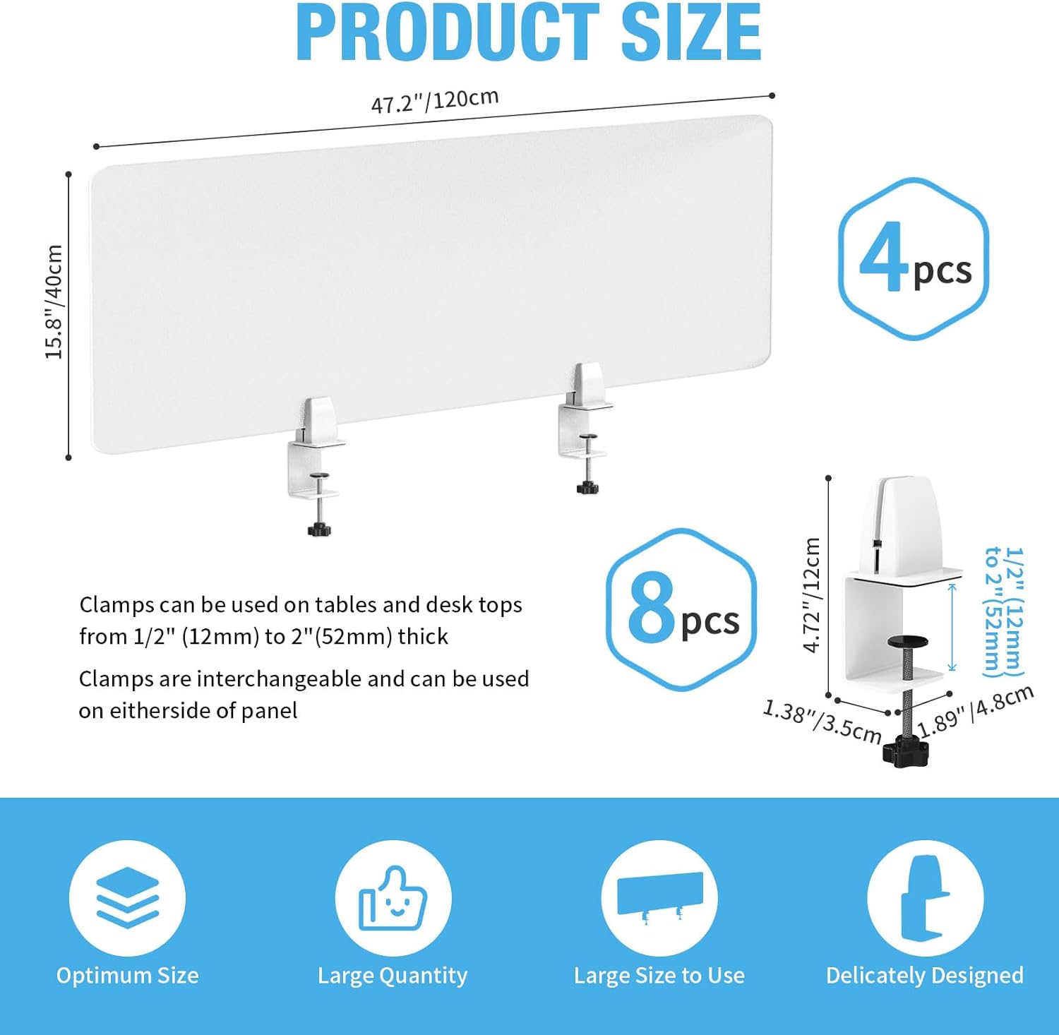 - 【Desk Divider Set】-Product Size: 47.2''L x 15.8''W;Amount: Pack of 4 Pcs;Quantity of Universal Clamps: 8;Material: Acrylic ;Colorl: Frosted;Our 4 sets of desk divider privacy panels can easily separate open work or study areas, allowing you to enjoy private space and prevent interference while also being with colleagues and classmates.