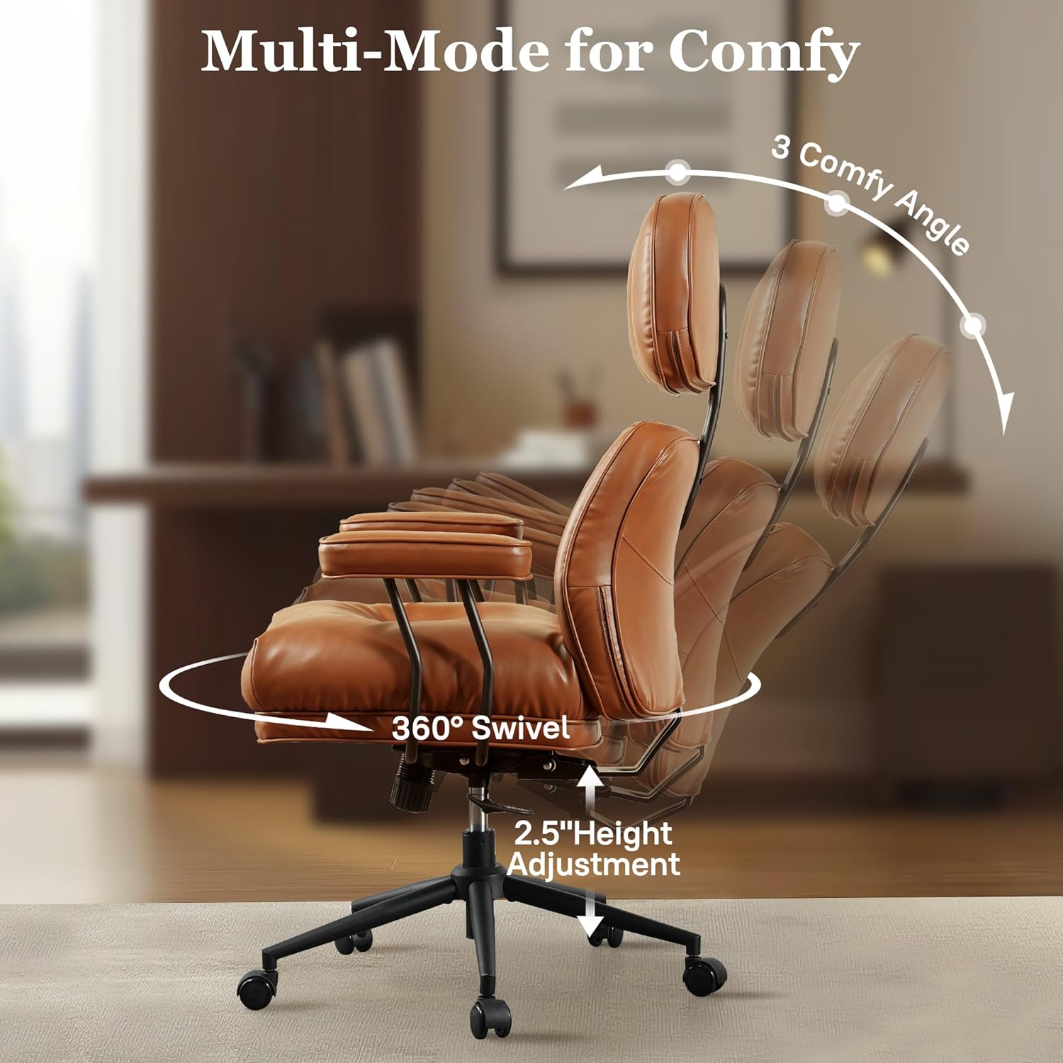 Mid Century Modren Big and Tall Office Chair,Large Ergonomic Executive Chair for Heavy Duty People, Computer Desk Task Chair with Wheels, Faux Lether Fabric Wide Chair for Home Sturdy,Brown(PU)