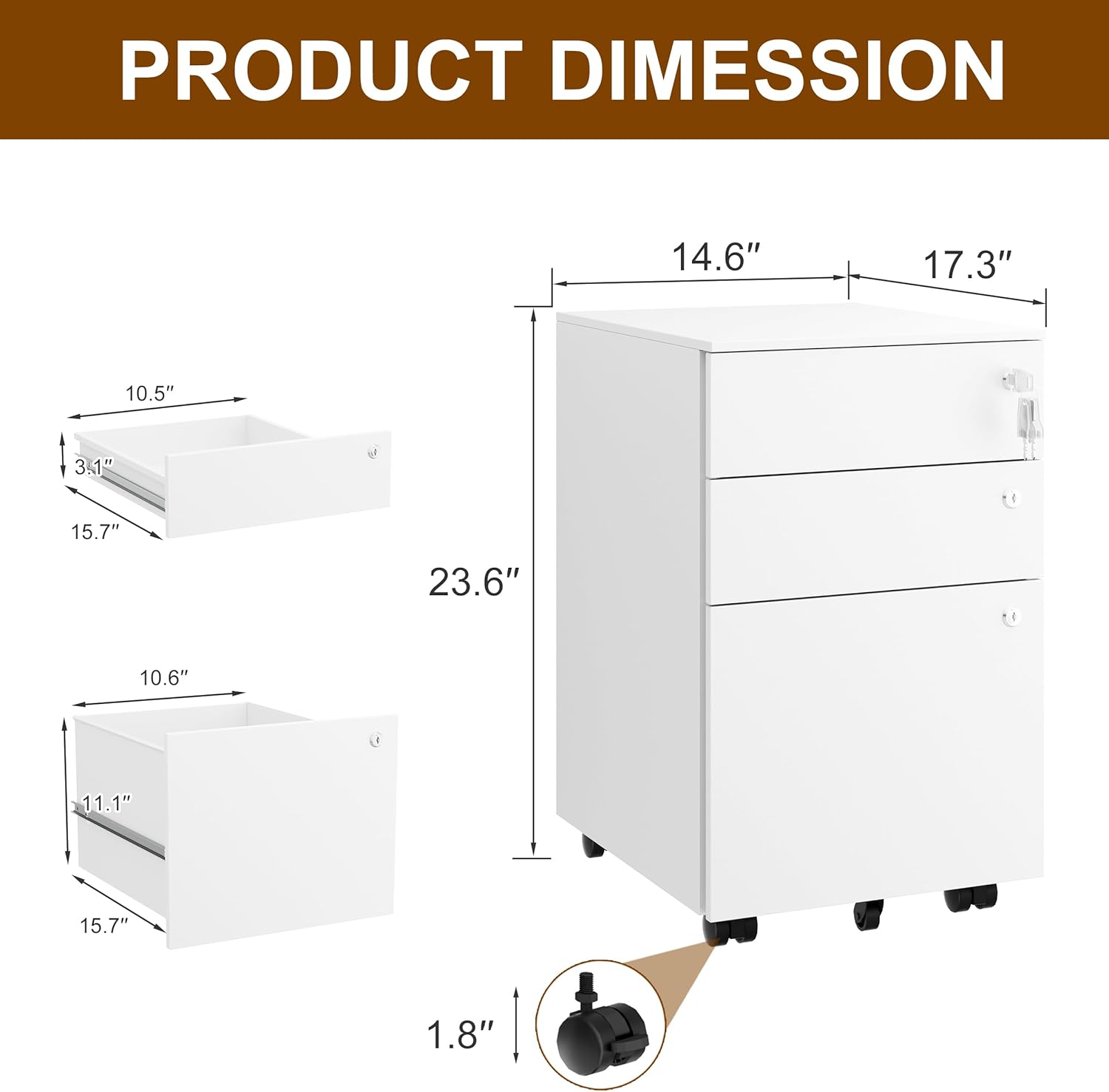 Mobile File Cabinet with 3 Locks, 3 Drawer File Cabinets for Home Office, Under Desk Metal Filing Cabinet for A4/Letter/Legal, Lockable, Fully Assembled Except castors, White