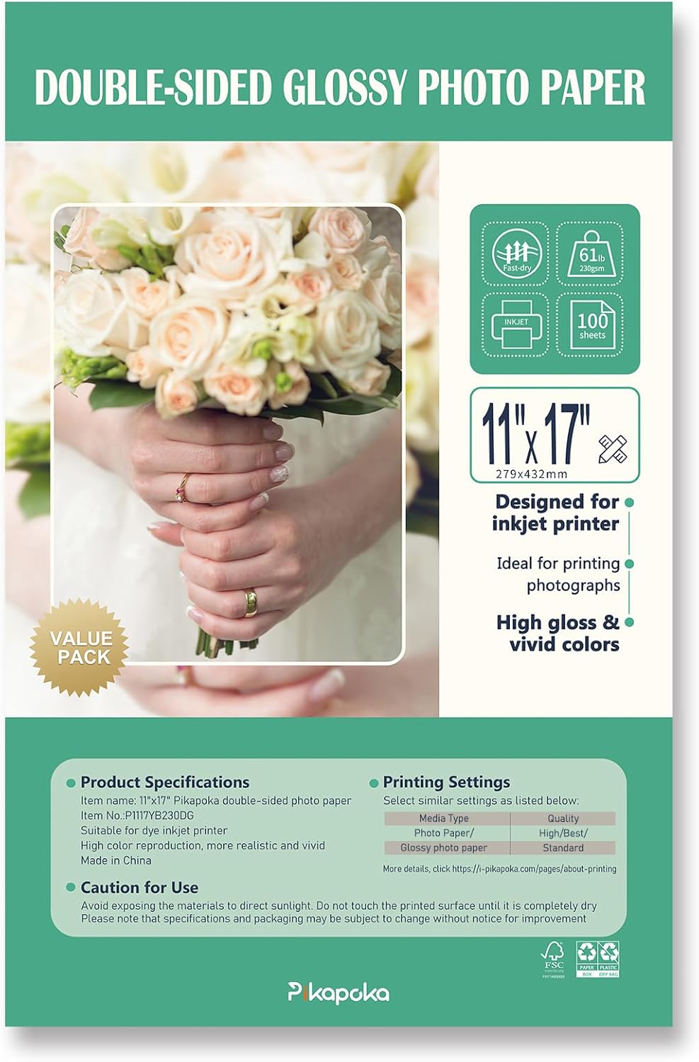 - Pikapoka double-sided glossy photo paper 61lb(230gsm), size: 11x17 in, 100 Pack