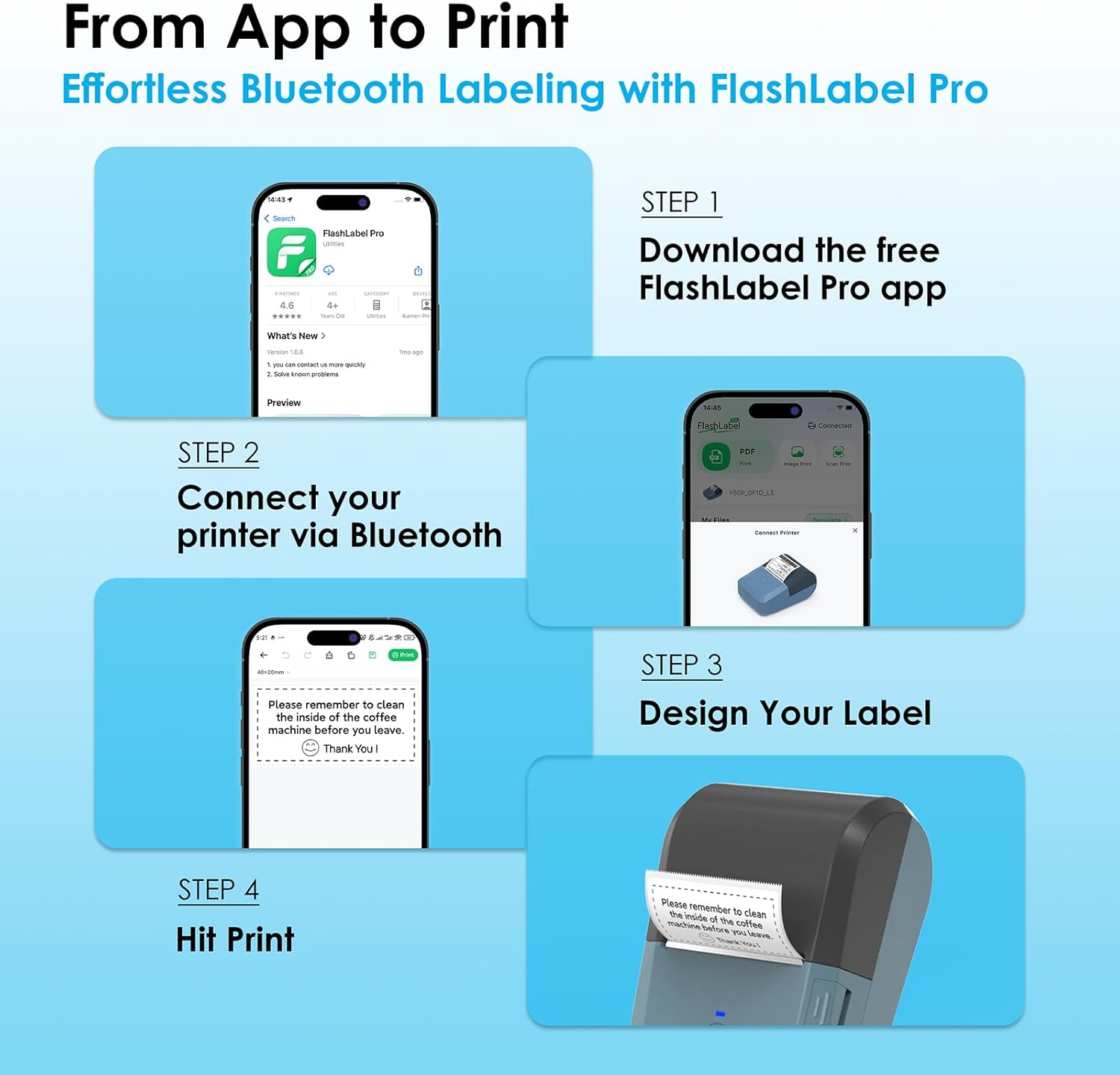 - Bluetooth Wireless Connection: KNAON Portable thermal label printer featuring Bluetooth technology, allowing seamless for with smartphones, tablets, and laptops for printing wirelessly with ease. For iOS and Android users, need to download the 'FlashLabel Pro' App from Apple Store or Google Play. Note: All devices CANNOT be connected directly to Bluetooth, and must be used through the 'FlashLabel Pro' app.