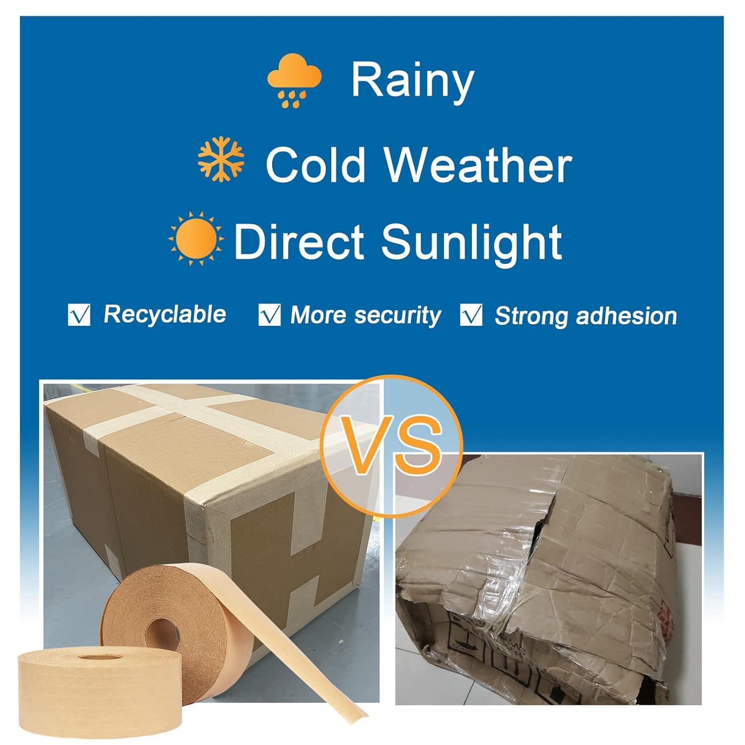 - Heavy Duty Use with Strong Adhesion: The water activated packing tape has great adhesion in rainy, snowy, and cold weather. The package remains sealed well. It withstands dust, water and direct sunlight. Great practical packing materials for business, office, and household use.