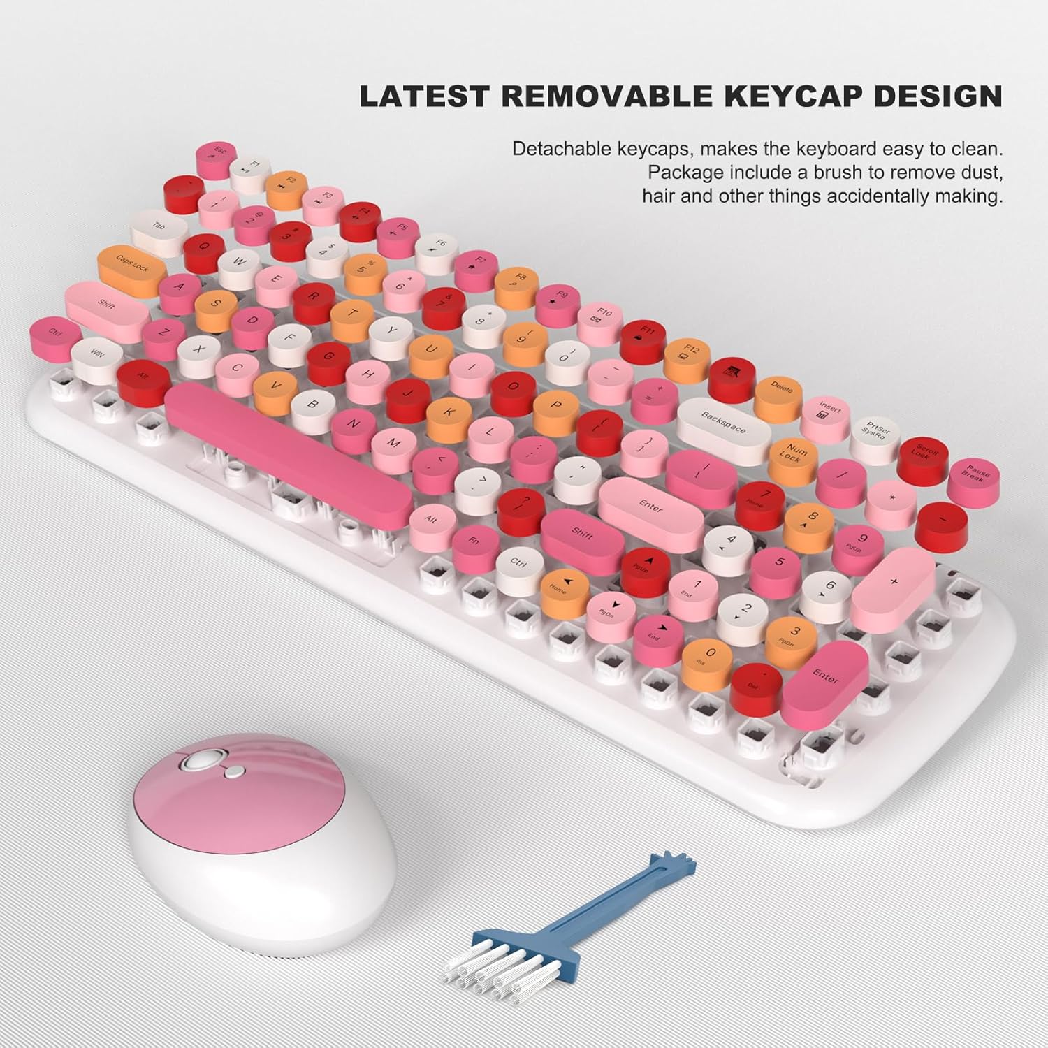Wireless Keyboard and Mouse Combo, MOWUX - Modern Compact Layout, Colorful Compact Candy Mouse and Retro Round Keyboard Set with Cover, for PC/Laptop/Windows/Mac - White Pink Colorful