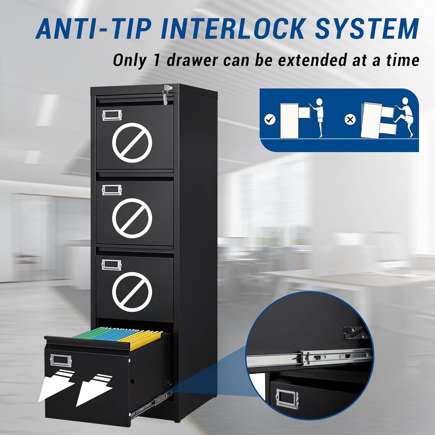 File Cabinet - 4 Drawers Vertical 17.8" Deep Lockable Filing Cabinet Black Metal Storage Cabinets for Home Office to Hanging Files Letter/Legal/F4/A4 Size