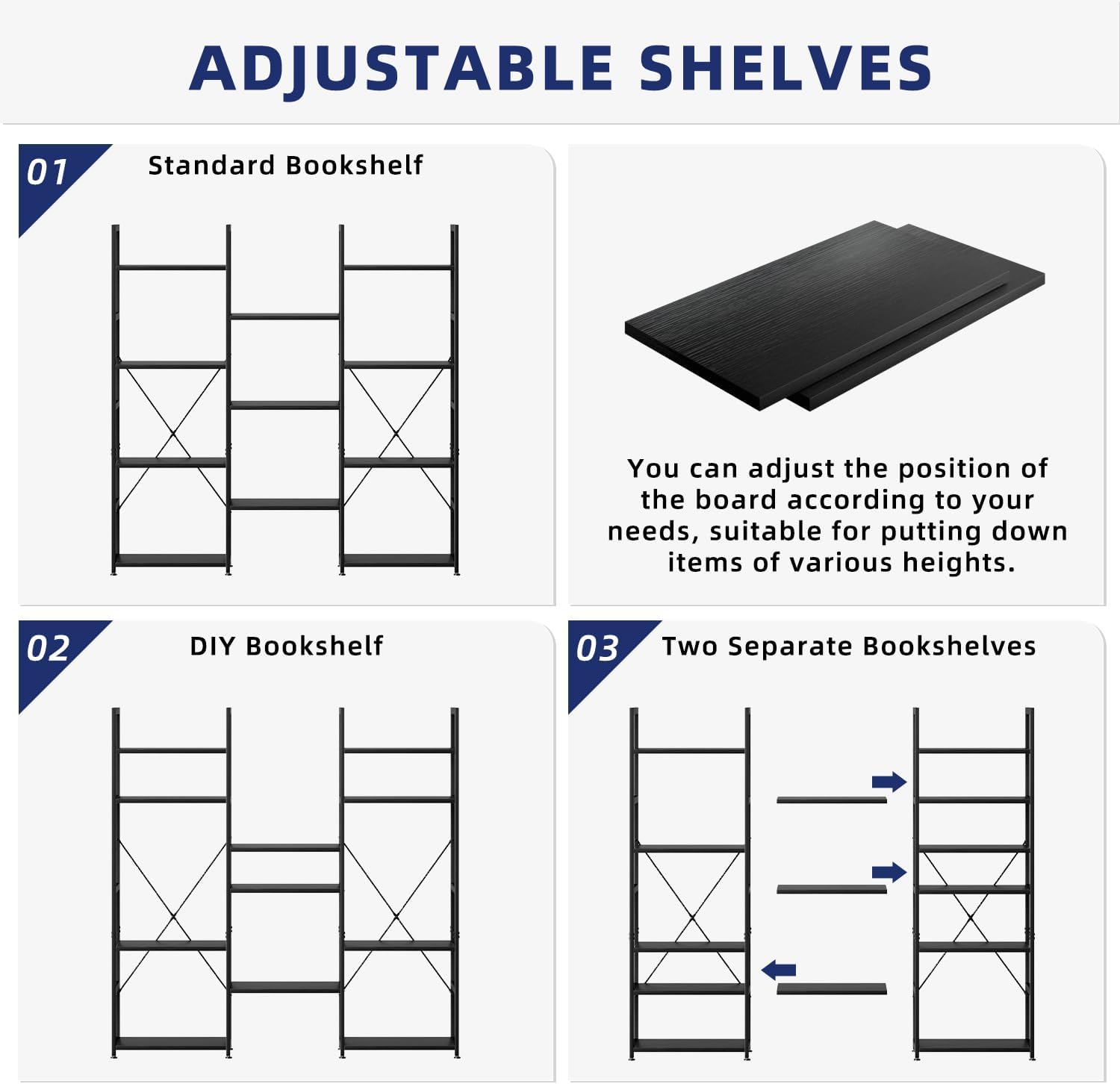 NUMENN Triple Column 4 Tier Bookshelf, Bookcase with 11 Open Display Shelves, Adjustable Rustic Industrial Style Book Shelves, Modern Bookshelves for Bedroom, Living Room and Home Office, Black