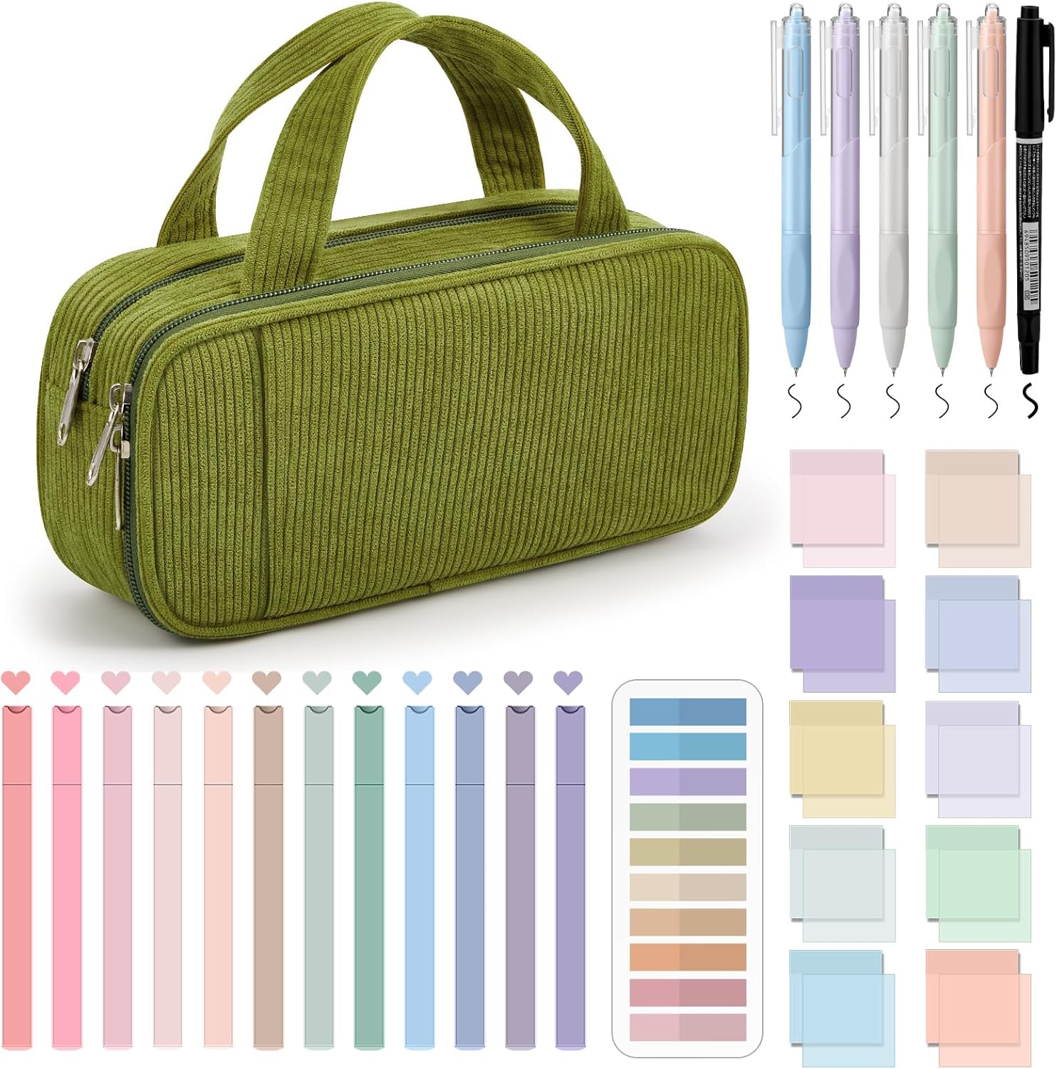 Jutom 39 Pcs Aesthetic Book Annotation Kit Highlighter with Pencil Case Bag Gel Pen Transparent Sticky Note Taking Bible Study College School Supplies(Green,Classic Style)
