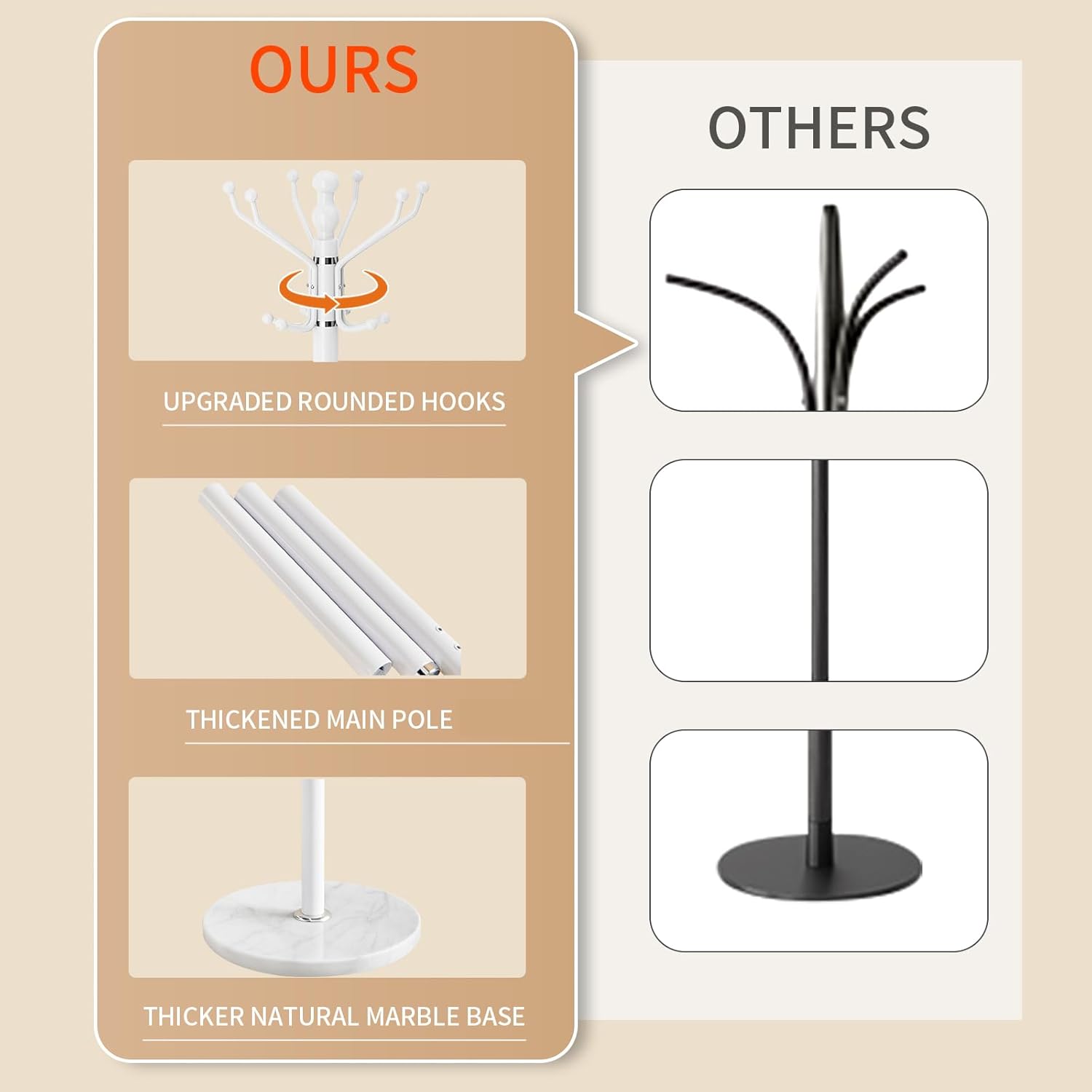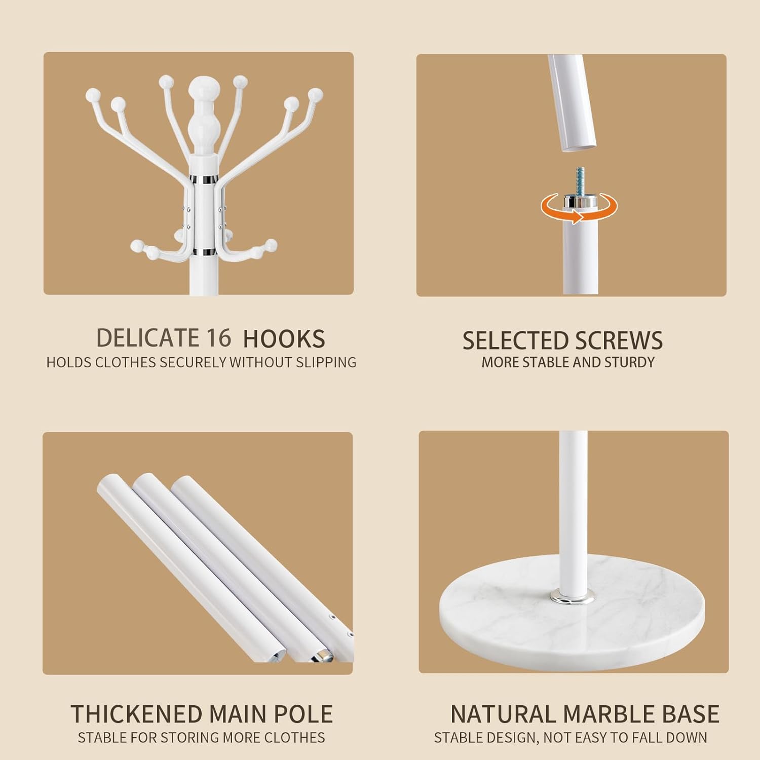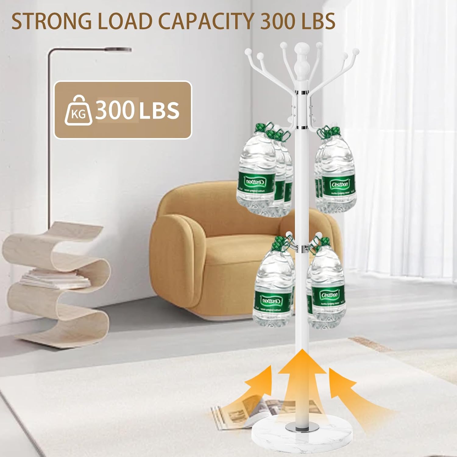 - 100% 15 INCH NATURAL MARBLE BASE:This coat rack freestanding is made of 100% natural marble,which diameter is 15 inch. Carefully selected natural marble, each piece has a unique vein carved by nature (not a quality issue). This base is capable of supporting 300 LBS, hanging heavy winter coats and briefcases very firmly without wobbling