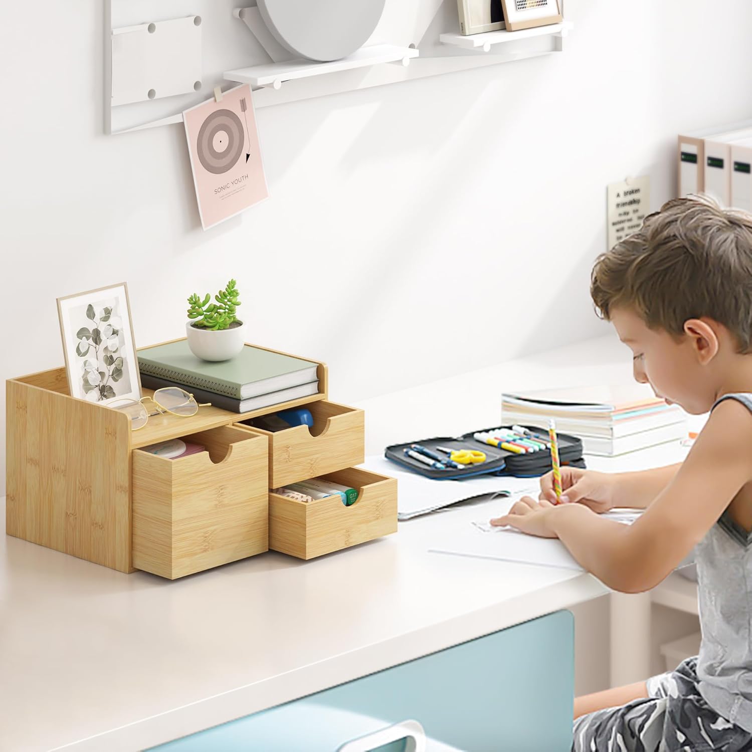 Wisuce Bamboo Desk Drawer Organizer, 3 Drawer Desktop Organizer with Drawers Tabletop Storage Organization Box for Office Home Toiletries Supplies Vanity, No Assembly Required