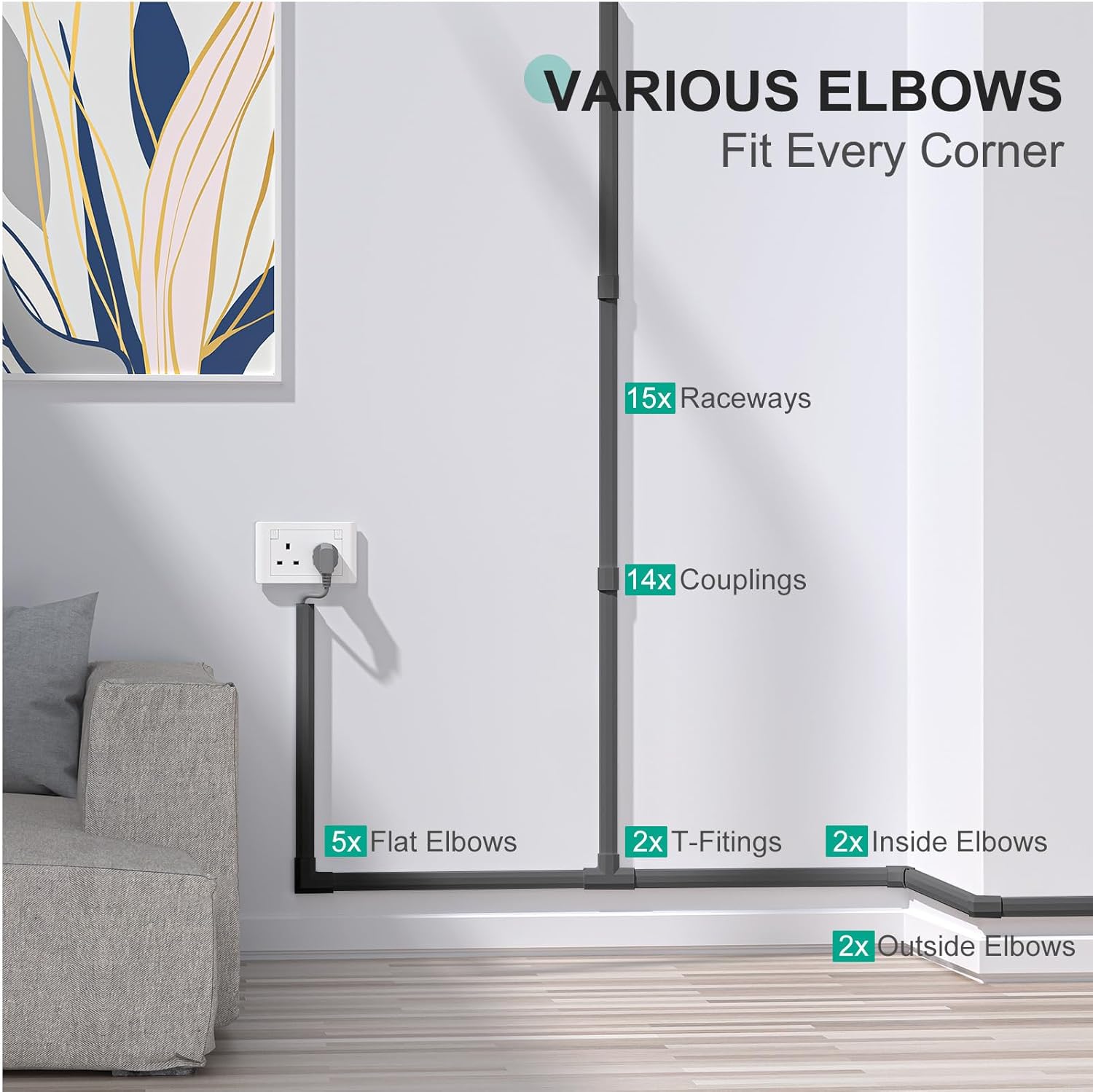 - 15 Pcs Black Cord Hider Kit: Our cable hider wall includes 15×plastic cable raceways channels (each channel is L16.9in×W1.18in×H0.6in, 254 inches total in length), 14×Couplings, 5×Flat Elbows, 2×T-connectors, 2× Inside Elbows, 2× Outside Elbows, 32×screws, 32×wall anchors, 2×rolls of double-sided tape and an installation guide, 254" cord covers for cords on wall enough for just about any job