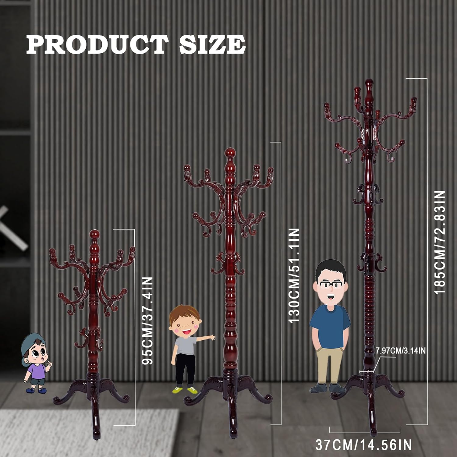 Coat Racks FreeStanding with 14 Hooks, Natural Wood Coat Rack with Solid Round Base, Adjustable Height Coat Racks, Easy Assembly for Hallway, Bedroom and Office (Reddish brown-Tri-Legged Base)