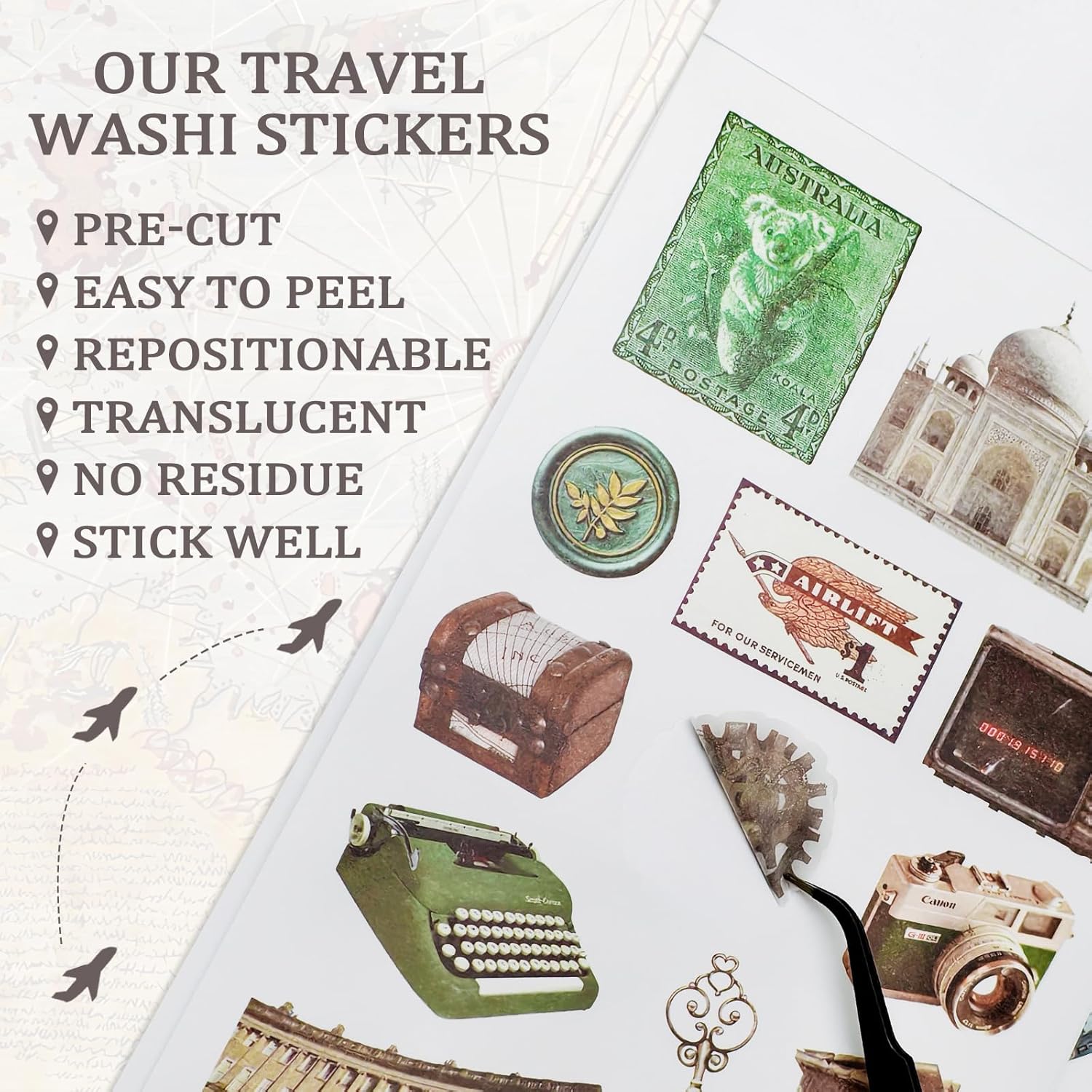 - Explore Iconic Destinations Around the World: Bring your travel memories to life with over 300+ vintage travel stickers for scrapbookingand 20 beautiful washi papers inspired by the world's most popular destinations. Whether it's the romantic streets of Paris, the ancient ruins of Greece, or the vibrant culture of Brazil, our collection captures the essence of iconic spots like France, Italy, the USA, Canada, Spain, Mexico, Hawaii, Japan, Thailand, Dubai, Bali, Australia, and more. Perfect for anyone who loves to travel or cherish their adventures!