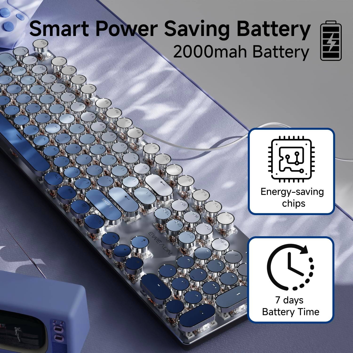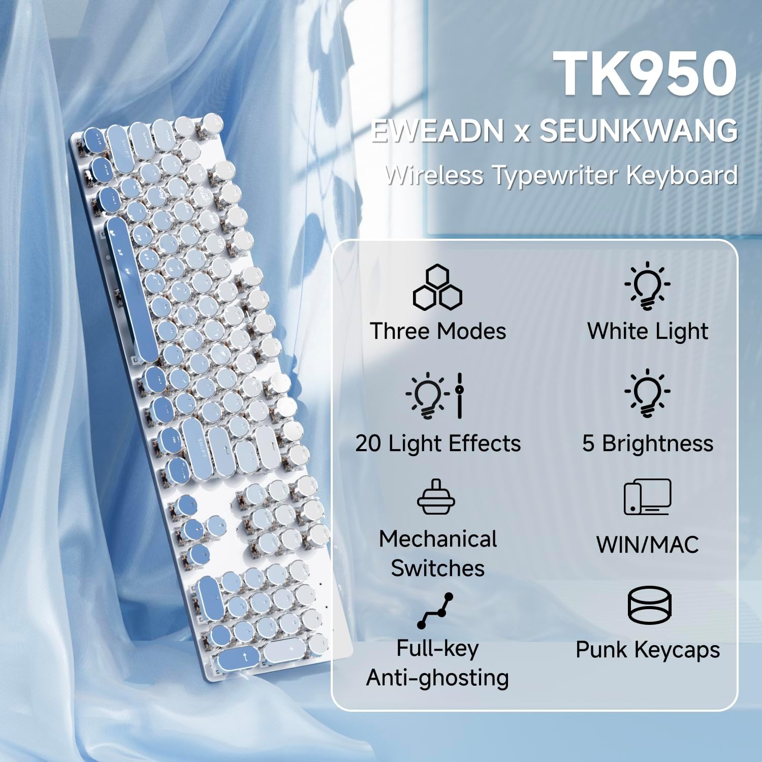 - Upgraded Gray Gradient Keycaps: TK950 wireless typewriter keyboard adopts gray gradient, two-color injection-molded retro punk round keycaps, clear backlight, and extremely durable. Stepped floating keycaps that fit your fingertips perfectly, precise position. Ergonomic foot support makes typing less tiring and more comfortable. Highly-durable mechanical blue switch responds faster and more quickly, accompanied by crisp click