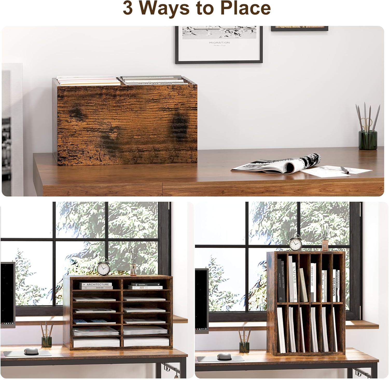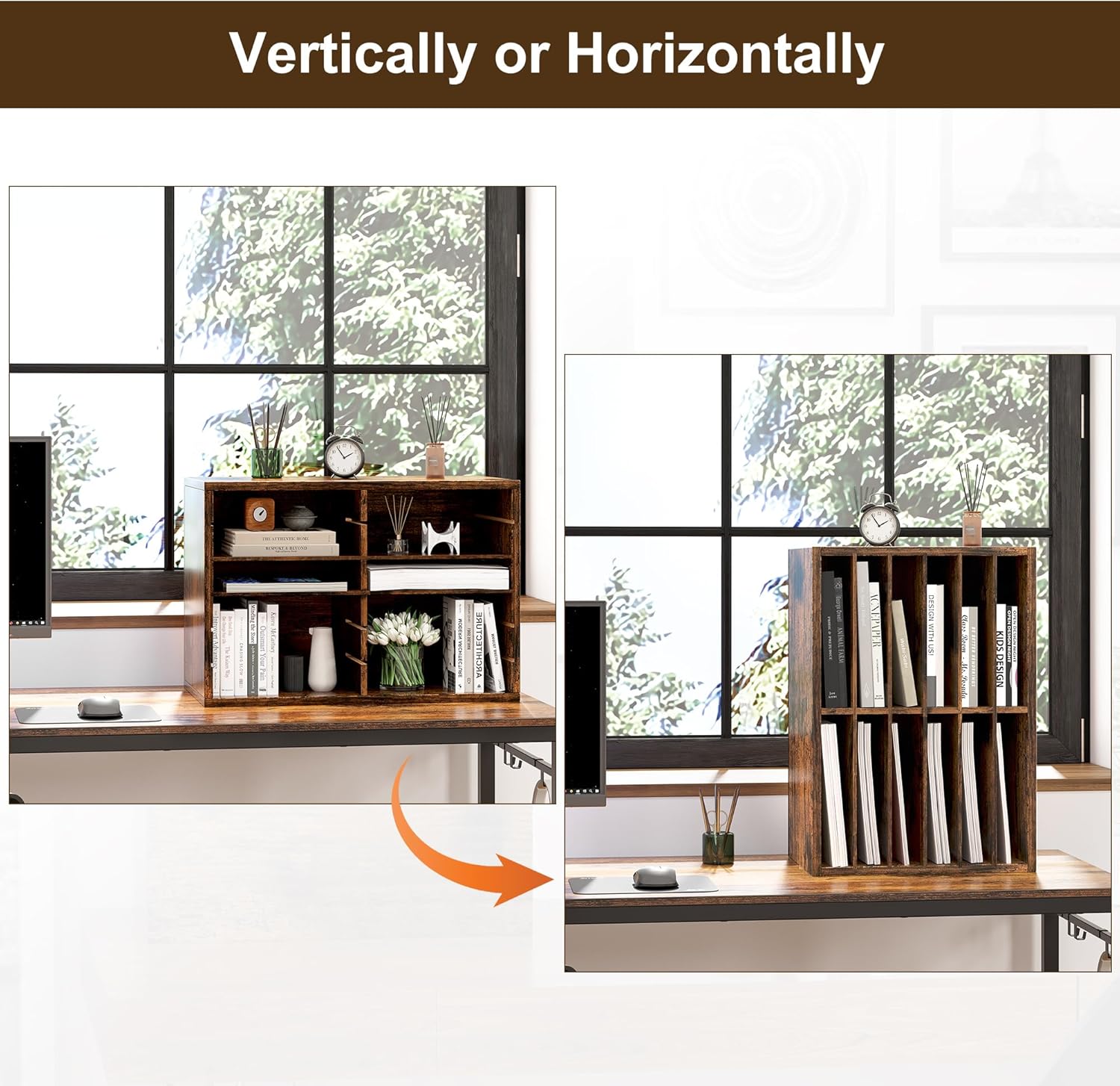 Mail Organizer Countertop, 12 Slots Wooden Desk File Literature Sorter, Adjustable Paper Storage Shelves Document Holder, Space Saving Desktop Mailbox for Office Classroom, Rustic Brown
