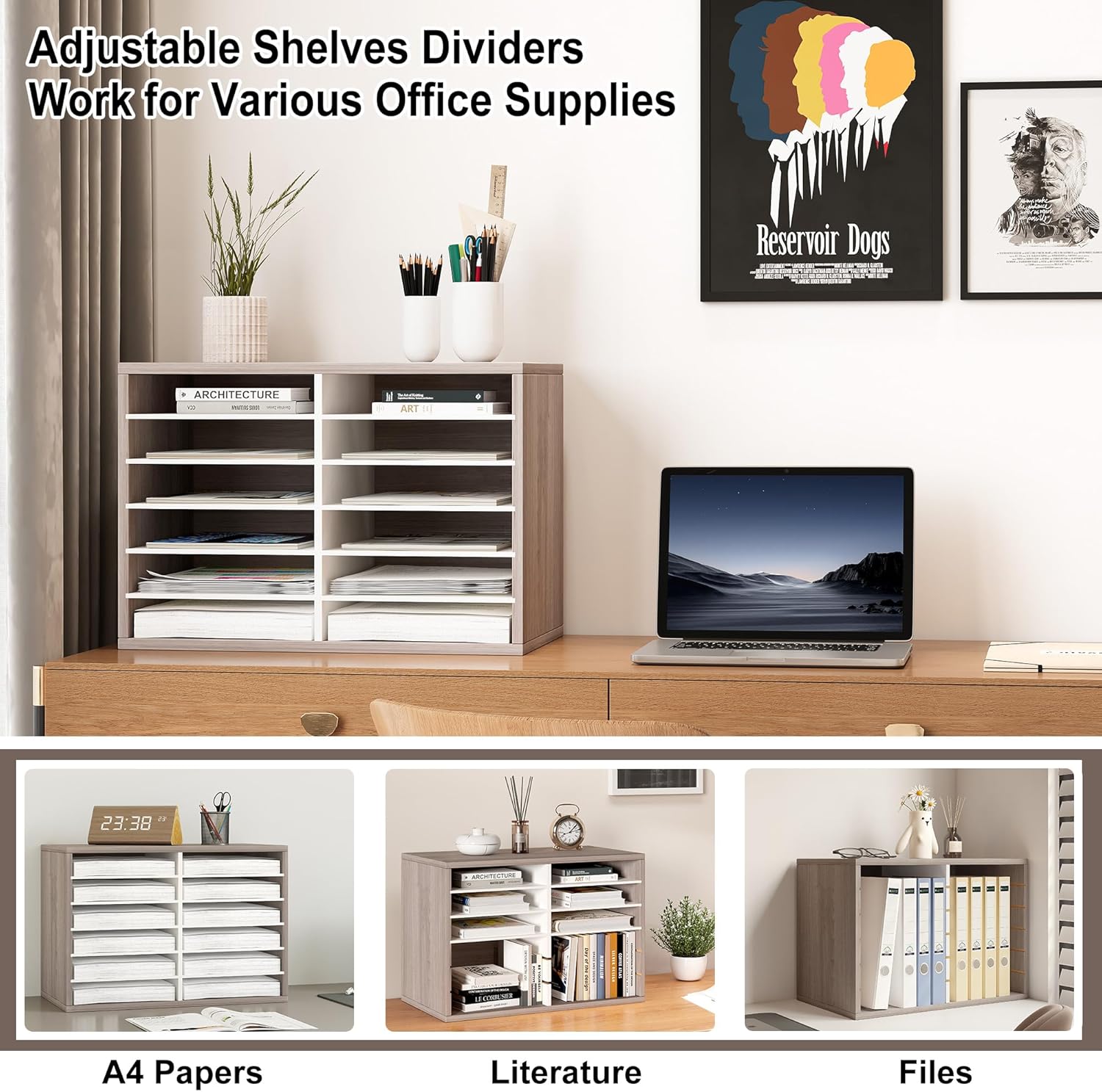 Mail Organizer Countertop, 12 Slots Wooden Desk File Literature Sorter, Adjustable Paper Storage Shelves Document Holder, Space Saving Desktop Mailbox for Office Classroom, Retro Grey/White