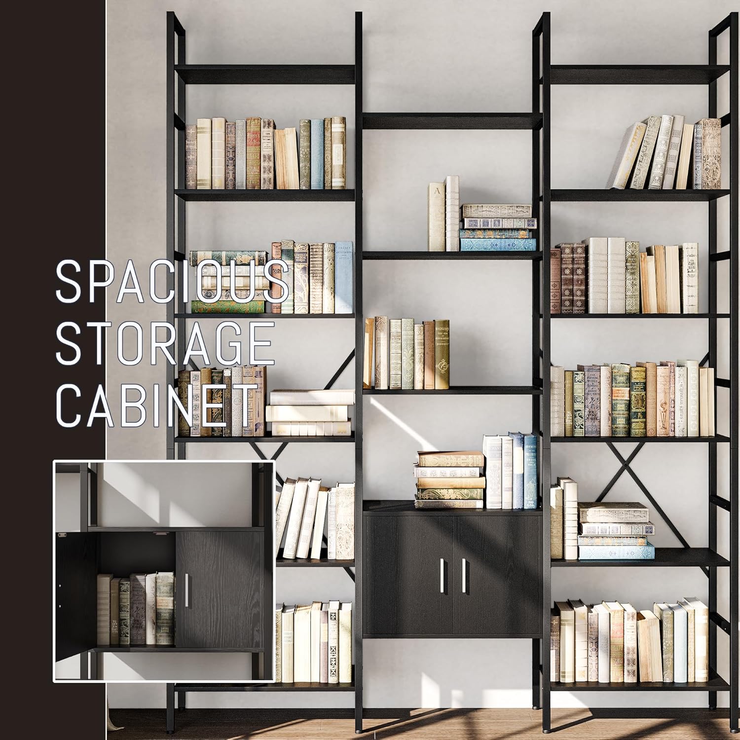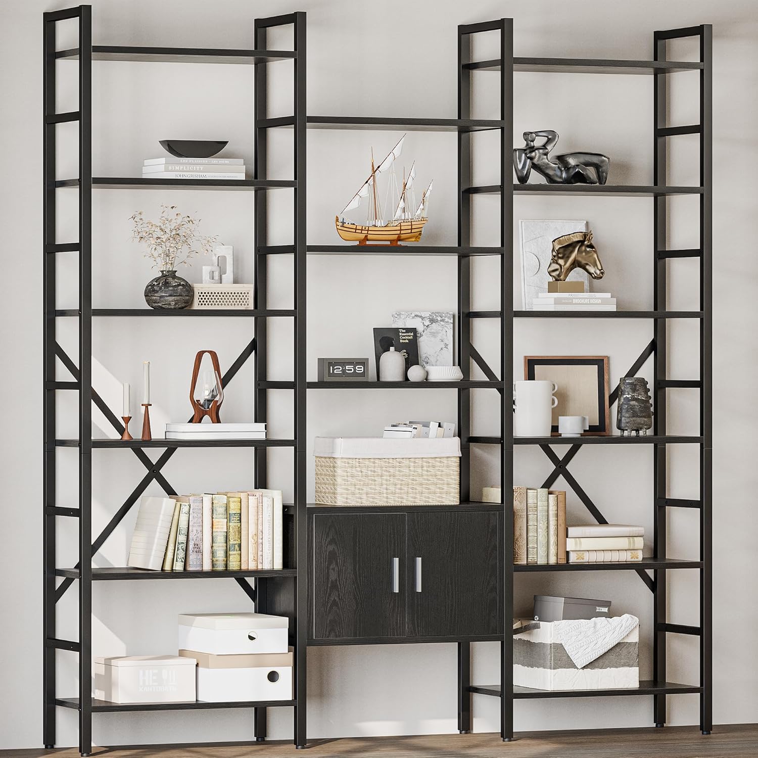 70x78 “ Triple 6 Tier Book Shelf, Industrial Large Bookcase with Storage Cabinet, Tall Bookshelf with 16 Open Display Shelves Metal Frame Furniture for Living Room Bedroom Home Office Black