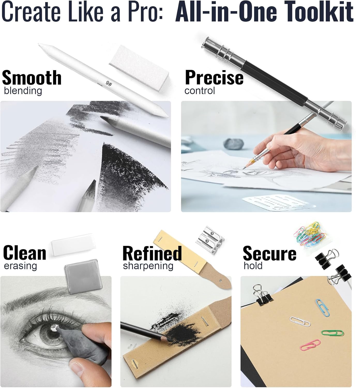 - EXTRA DRAWING & SKETCHING SUPPLIES: Our sketching supplies are packed with essential tools to refine your artwork and explore new styles. The art supplies include 3 blending stumps, 1 paintbrush, 1 dual-hole sharpener, 1 pencil extender, 1 sandpaper block, 1 refillable water brush pen, 1 white eraser, 1 vinyl eraser, 25 paper clips, 2 binder clips, 1 sponge and 1 travel case