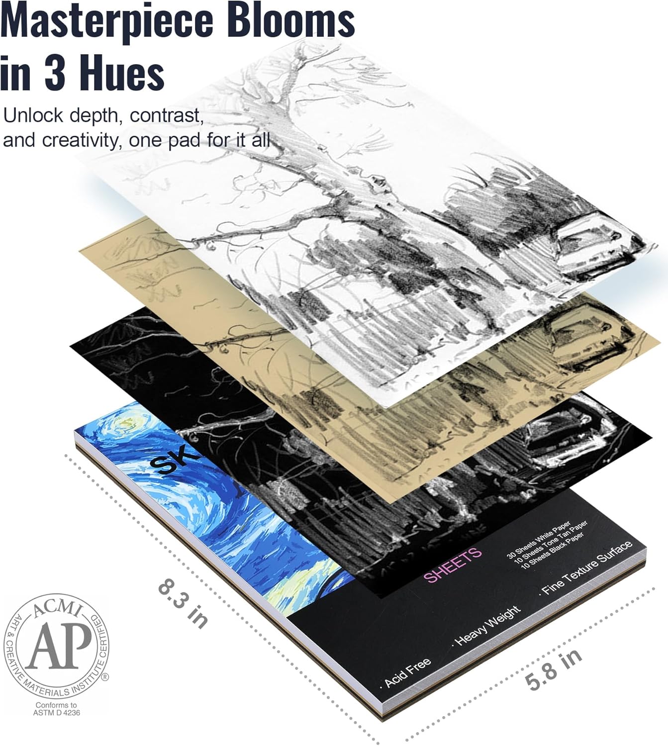 - UNIQUE 3-COLOR SKETCH PAD & COLORING BOOK: Unlock new artistic possibilities with a sketchpad featuring 50-page sections in 3 distinct colors. The varied paper tones provide the ideal canvas for dynamic shading, highlights, and contrasting effects, allowing you to experiment with different styles using sketching supplies. Complementing this is a 32-page coloring book filled with intricate designs, providing a relaxing coloring experience