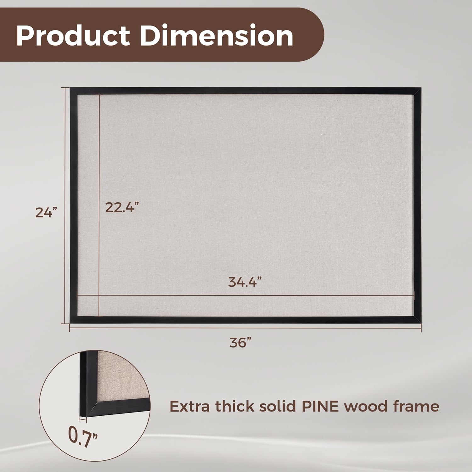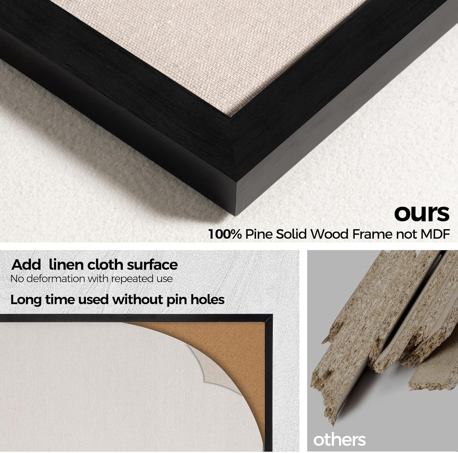 - Pine Frame Material: Our cork boards for walls is made of 100% pine wood which has well self-healing ability and repairability. The pin board features a four-ply splint design that is strong and thick enough not to be punctured by thumbtacks.