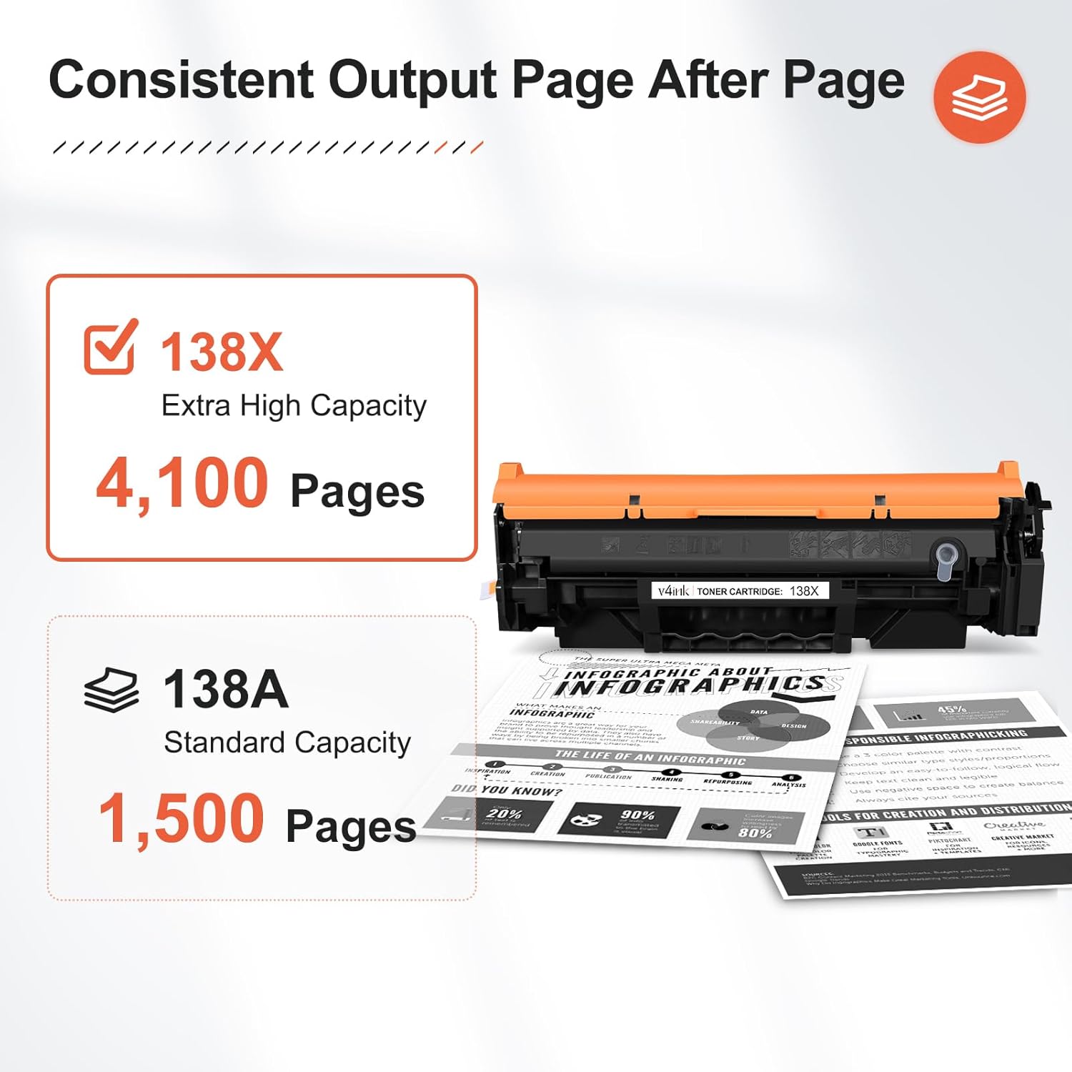 - Print More, Spend Less: 4,100 pages per v4ink 138X Black toner cartridge at 5% coverage (Letter/A4). More than 2X the other 138A W1380A toner cartridge Page Yield