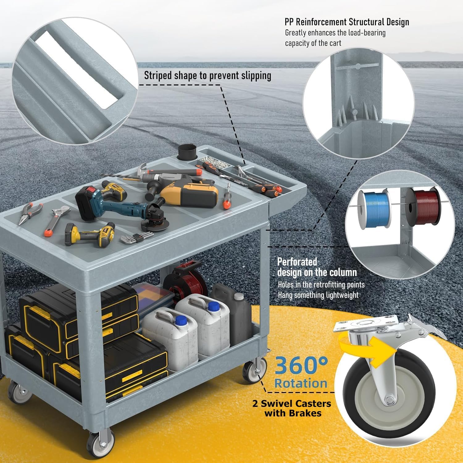 2 Tier Rolling Utility Cart on Wheels, 550 lbs Capacity Flat Top Plastic Service Cart with Lipped Shelves, 46 x 26-Inch Heavy Duty Work Cart for Warehouse, Garage, Cleaning, Gray