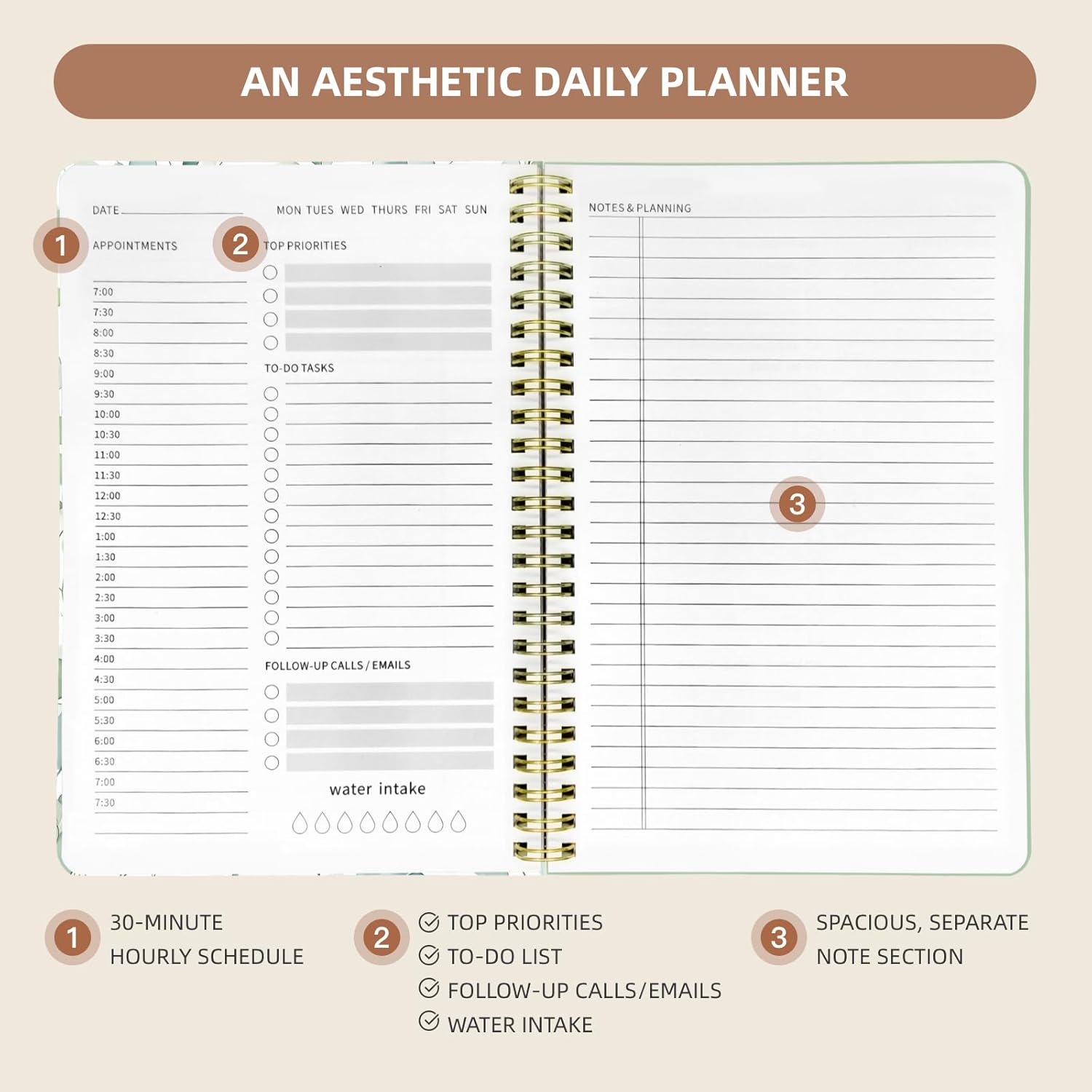 - Functional Planner: Hourly Schedule, To-Do List, Follow-Up Task Section, Water Intake Tracker, Blank Lined Notes Page