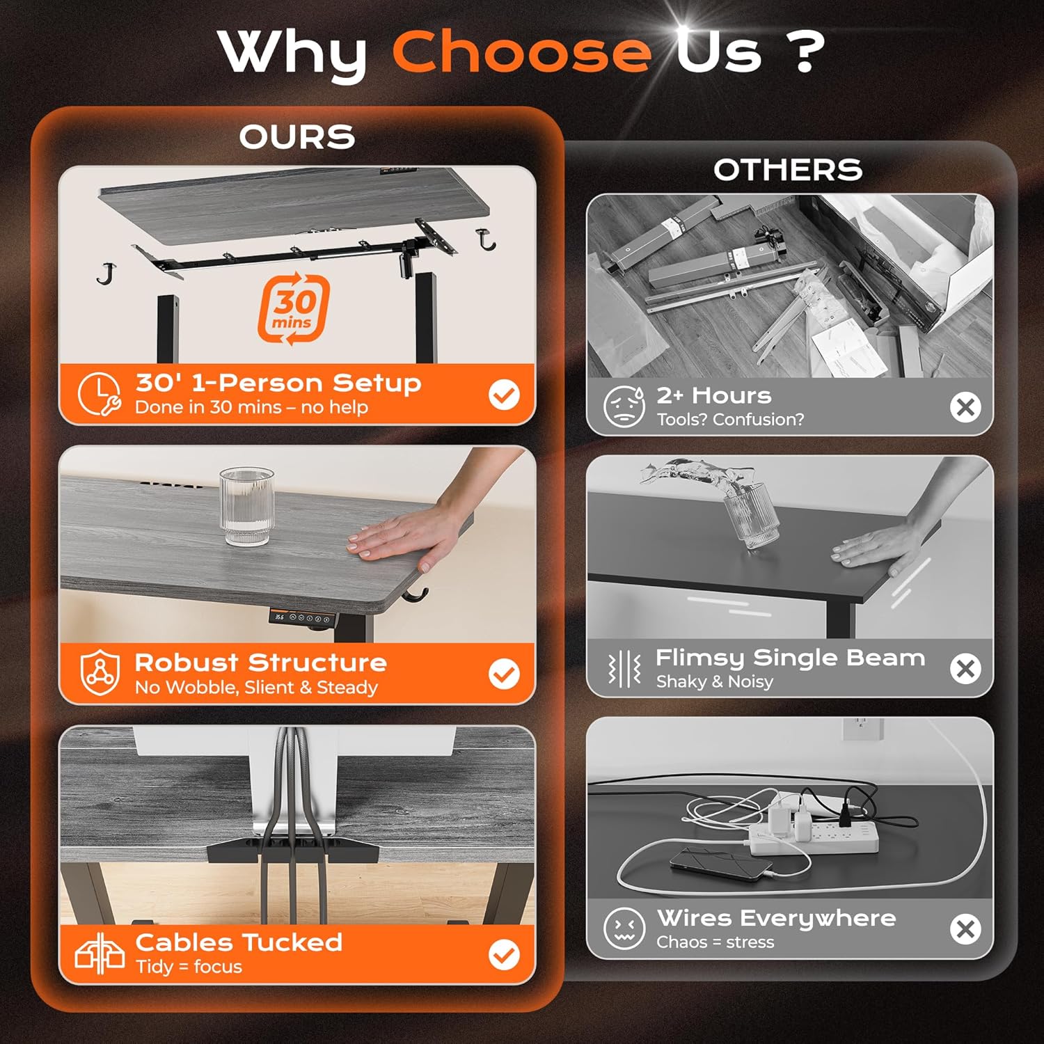 - ăBuilt to Last with Exceptional StabilityăThe industrial-grade steel frame and T-shaped design of the stand up desk support up to 220 lbs, ensuring stability and reliability for years to come. Paired with a durable motor, this home office desk is designed to meet the demands of your dynamic workday
