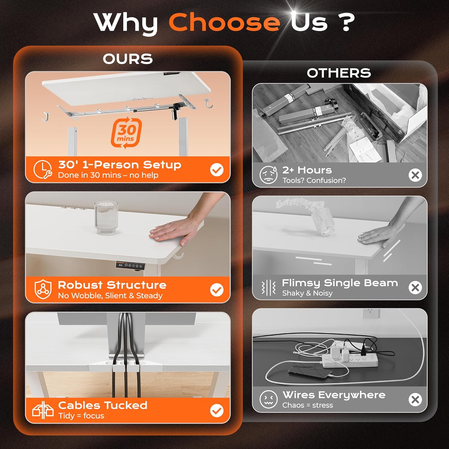 - ăBuilt to Last with Exceptional StabilityăThe industrial-grade steel frame and T-shaped design of the stand up desk support up to 220 lbs, ensuring stability and reliability for years to come. Paired with a durable motor, this home office desk is designed to meet the demands of your dynamic workday