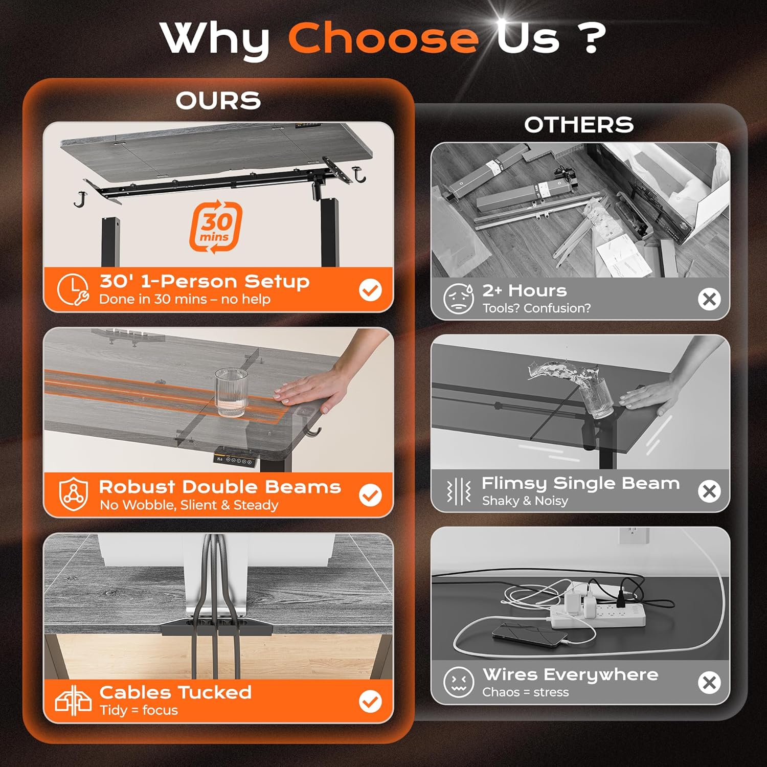 - ăBuilt to Last with Exceptional StabilityăThe industrial-grade steel frame and T-shaped design of the stand up desk support up to 220 lbs, ensuring stability and reliability for years to come. Paired with a durable motor, this home office desk is designed to meet the demands of your dynamic workday