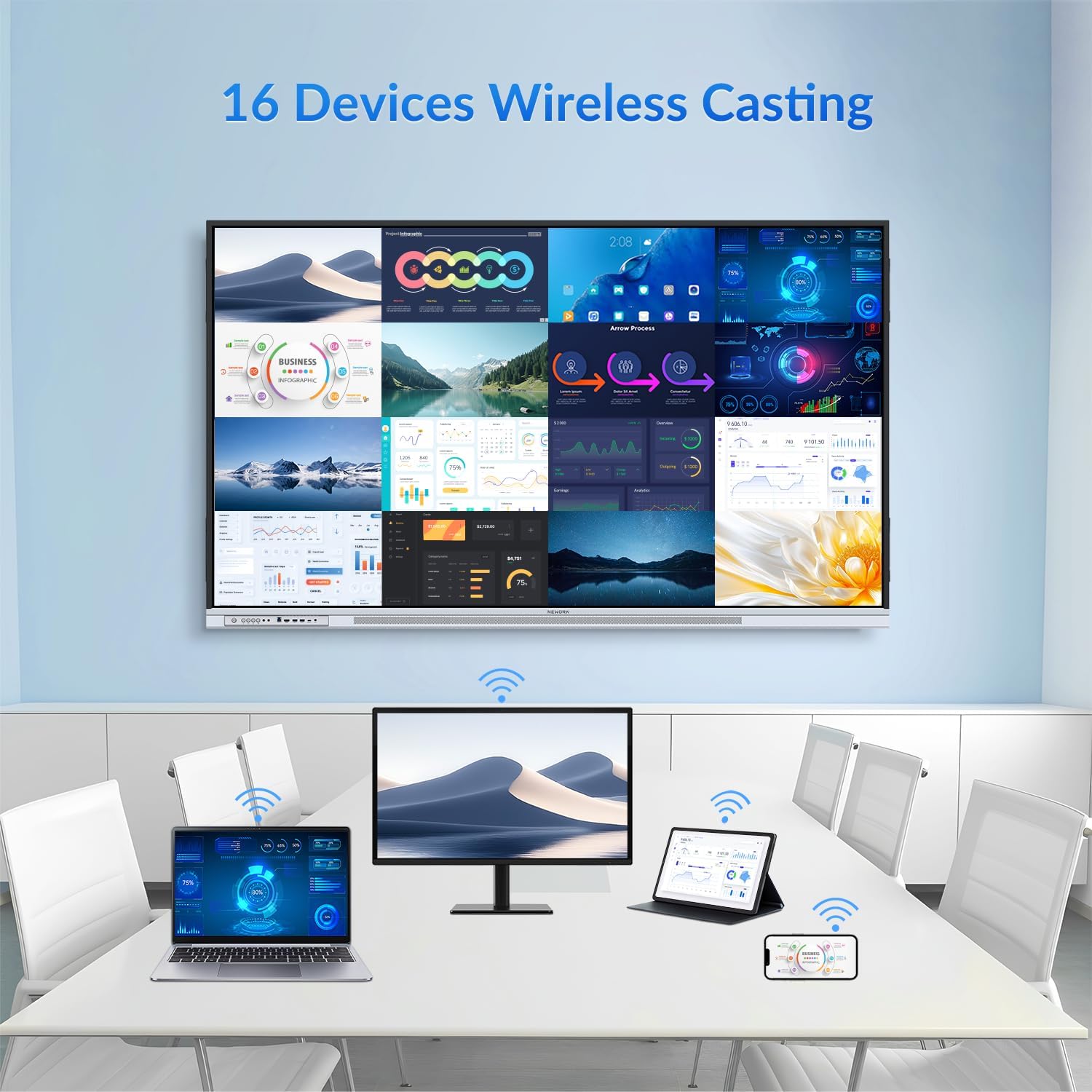 - Wireless Screen Sharing: Easily cast content wirelessly from smartphones, tablets, and laptops —with support for up to 16 devices at once—perfect for digital classrooms and hybrid workspaces.