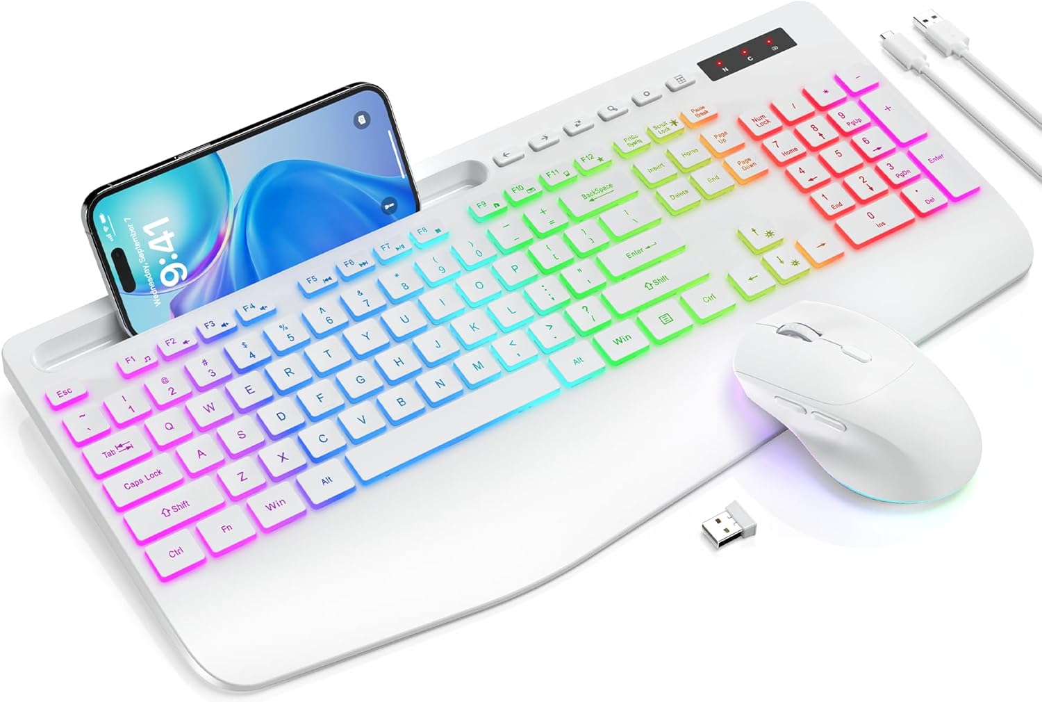 Wireless Keyboard and Mouse Backlits, Wrist Rest, LED Mouse, Rechargeable Ergonomic Keyboard with Phone Holder, Silent Light Up Combo for Computer, Mac, PC, Laptop, Chromebook (White)