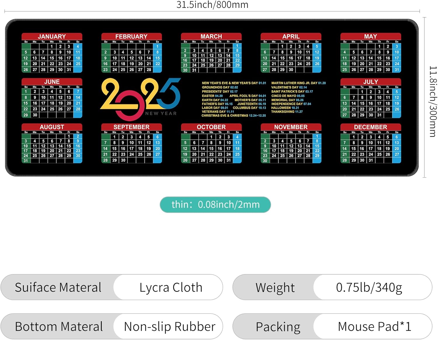 Dynippy Thin Extended Gaming Mouse Pad (31.5 * 11.8 * 0.08 inch) with Stitched Edges Large Mousepad Long XXL Keyboard and Mouse pad Desk Mat for Gaming Office & Home - 2025 Calendar Holidays