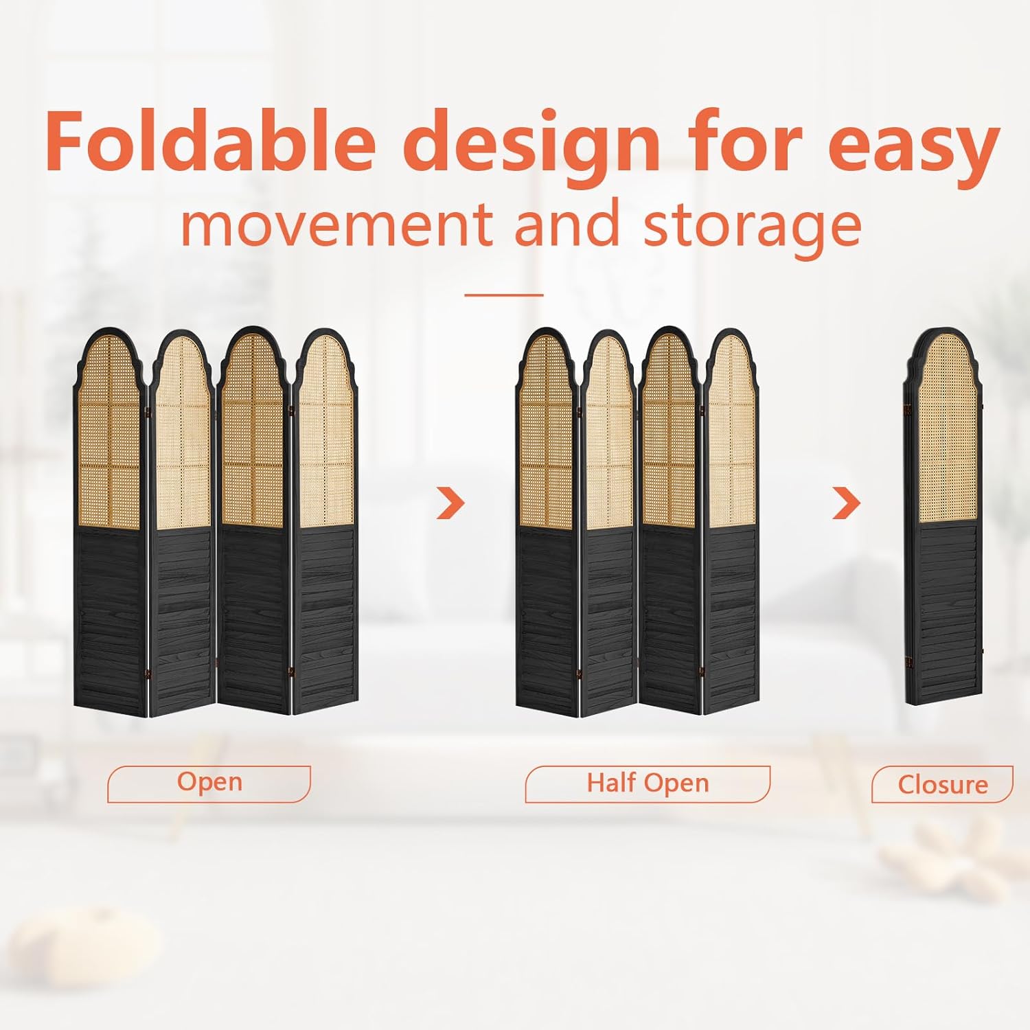 4 Panel Rattan Folding Screen Room Divider, Privacy Dividers for Rooms, Louvered Partition Dividers, Room Divider Panel for Bedroom, Dressing Room, Balcony, Black