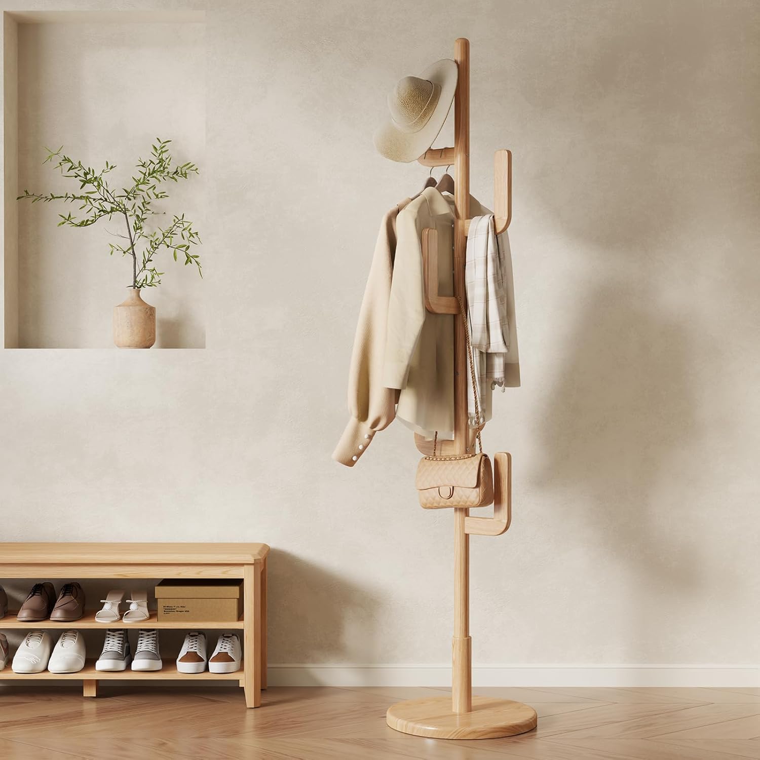 - 【HEIGHT-ADJUSTABLE DESIGN】Our wooden coat rack offers versatility with three height settings, achieved by simply adjusting the number of main rods. It accommodates coats, bags, ties, and more, catering to every family member's needs