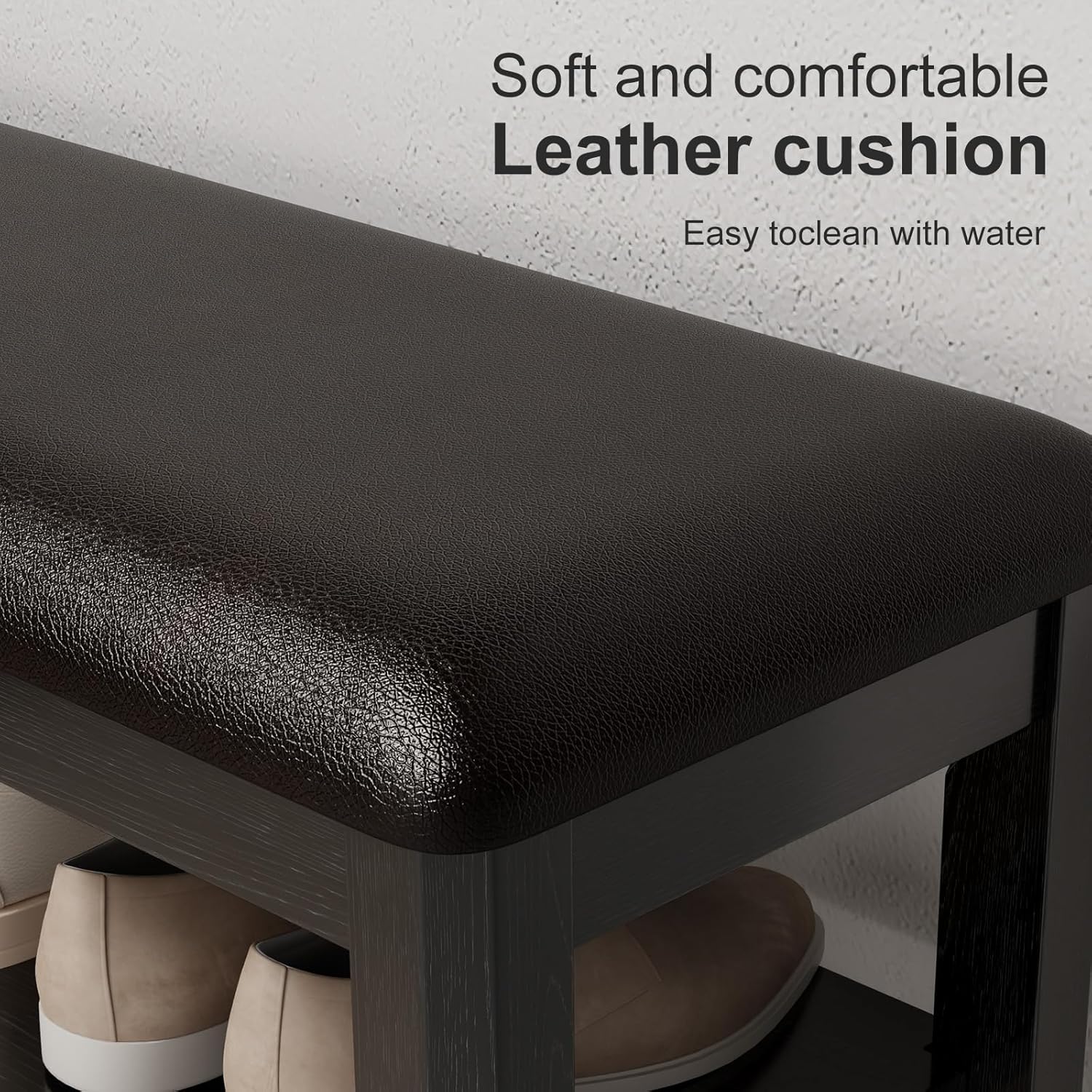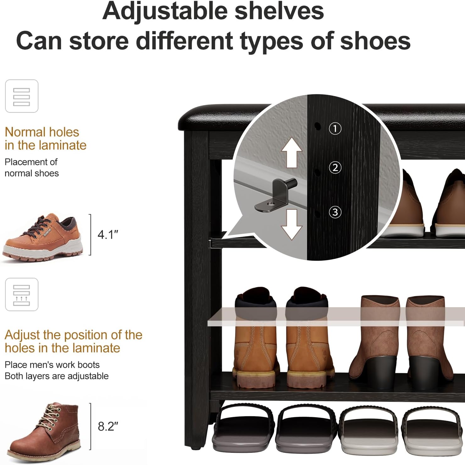 Shoe Bench with Leather Cushion, 3 Tiers Shoe Storage Bench Height Adjustable, Walnut Wood Entryway Bench for Hallway, Mudroom