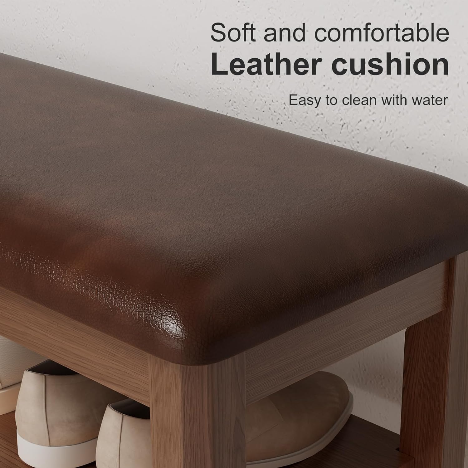 Shoe Bench with Leather Cushion, 3 Tiers Shoe Storage Bench Height Adjustable, Walnut Wood Entryway Bench for Hallway, Mudroom