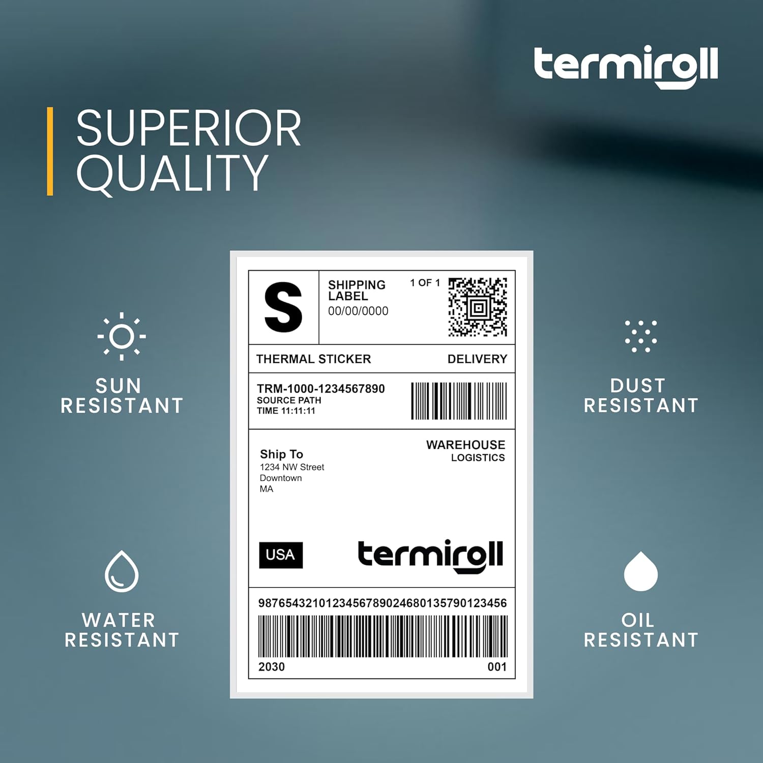 - Durable, Water, Sun, Dust and Oil Resistant & BPA-Free: Made with high-quality materials, Termiroll thermal labels 4"x6" are resistant to water, oil, smudging, and scratches, ensuring print quality remains intact. 100% BPA & BPS-Free for safety and sustainability-perfect for reliable use with all your thermal shipping labels.