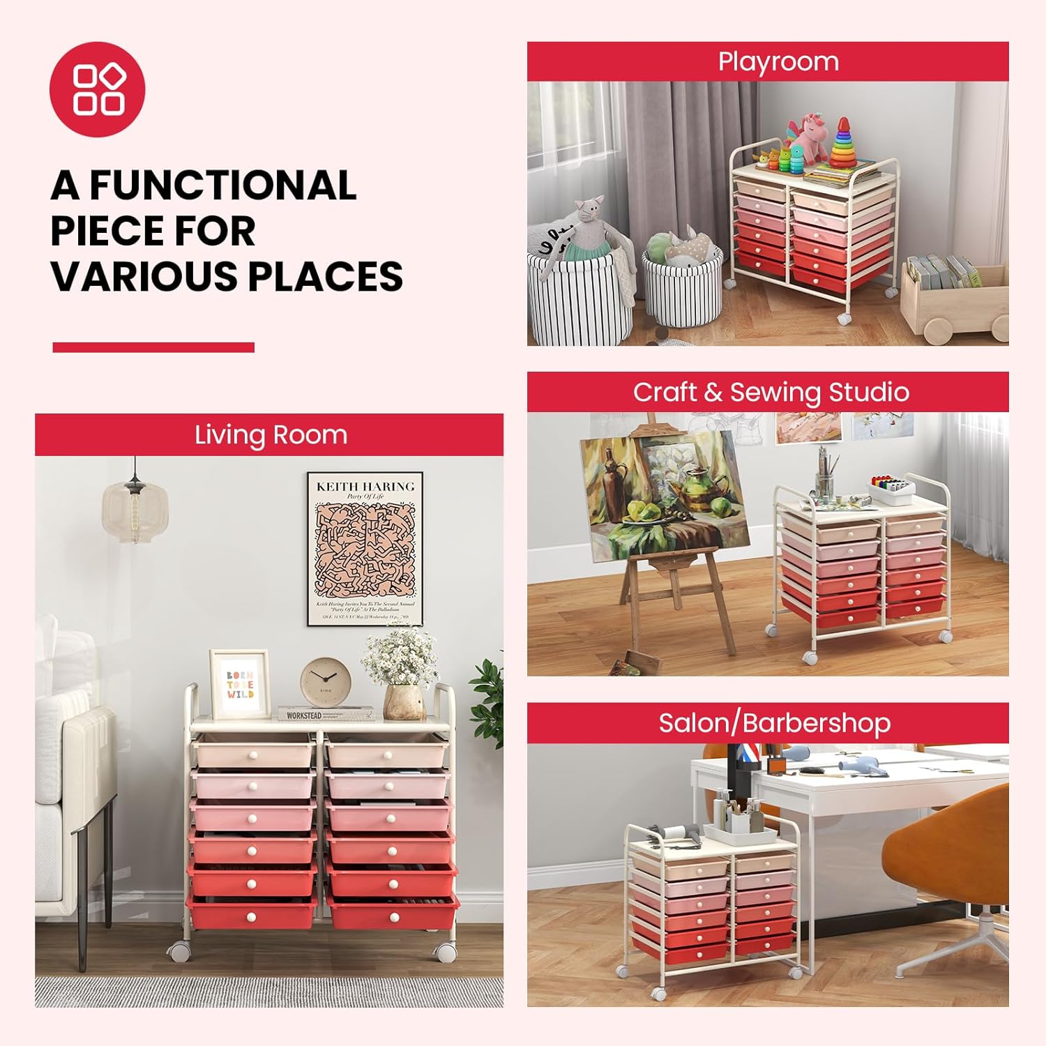Giantex 12 Drawers Rolling Cart, Mobile Storage Drawer Cart, Classroom Organizer Cart for Office School Supplies Tools Scrapbook Paper Craft Small Printer, Utility Cart on Wheels, Pink Gradient