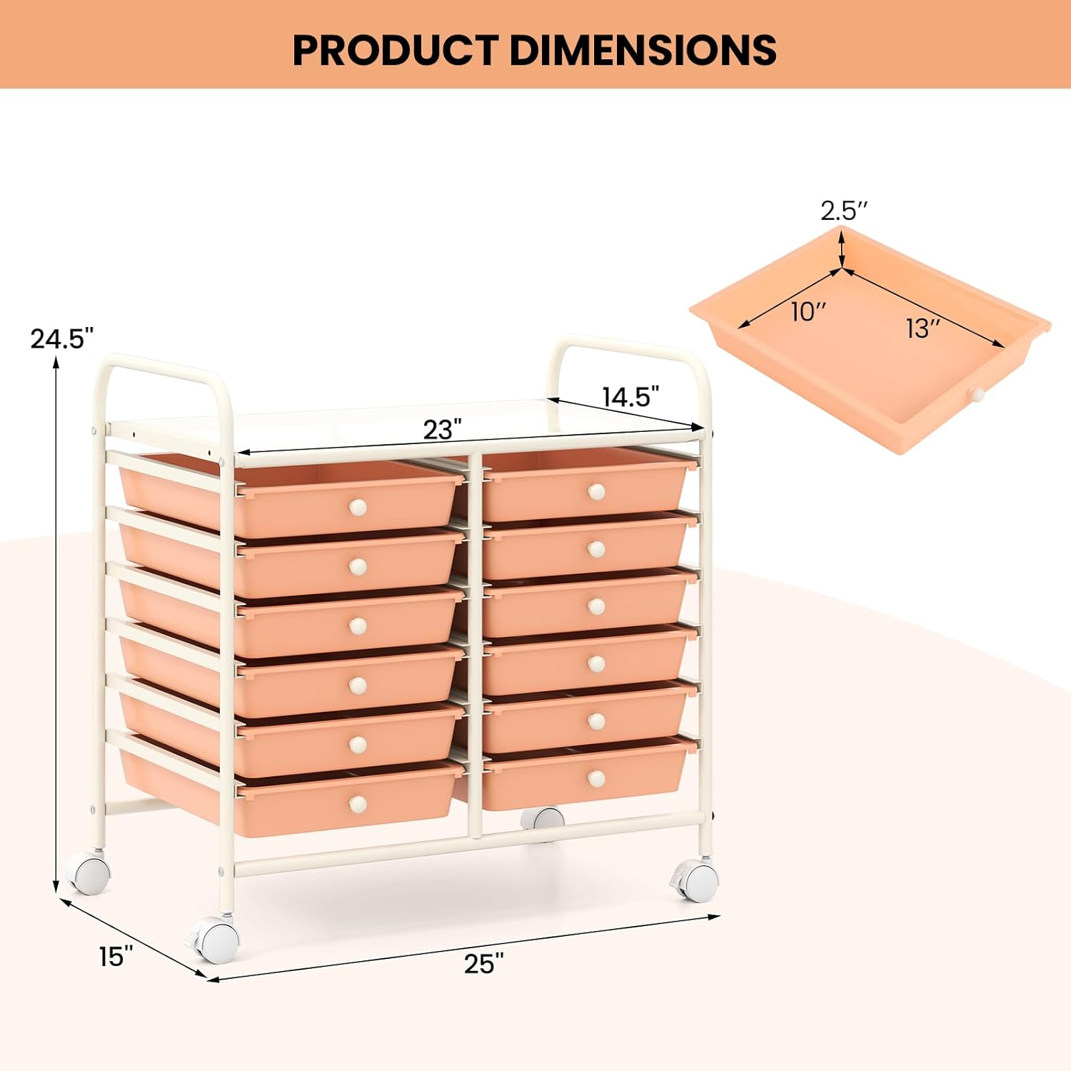 Giantex 12 Drawers Rolling Cart, Mobile Storage Drawer Cart, Classroom Organizer Cart for Office School Supplies Tools Scrapbook Paper Craft Small Printer, Utility Cart on Wheels, Peach Fuzz