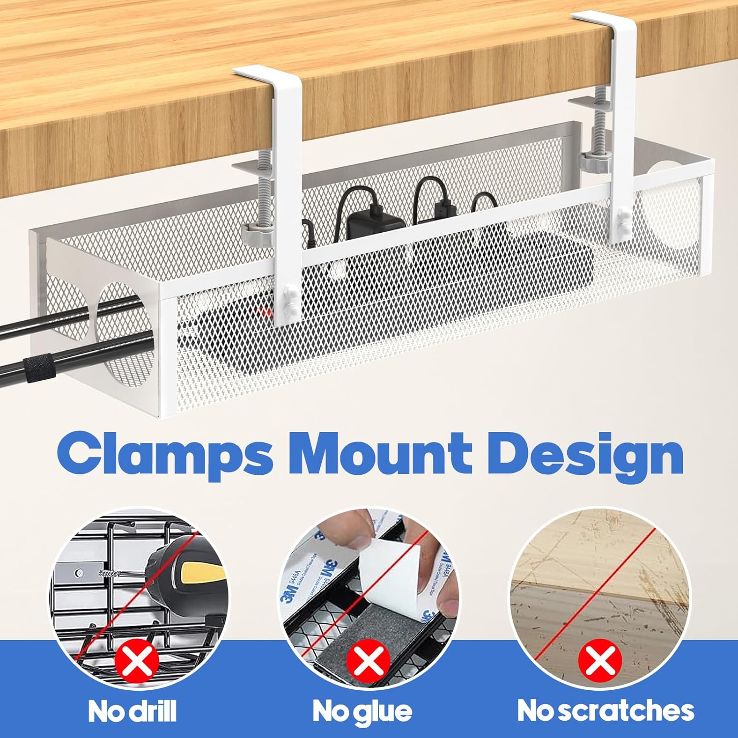 Under Desk Cable Management Tray No Drill 15.1’’, Metal Mesh Cable Management Box with Hybrid Side Slots & Reinforced Basket,Adjustable Cable Tray with Wire Management for Office Home,1 Pack (White)