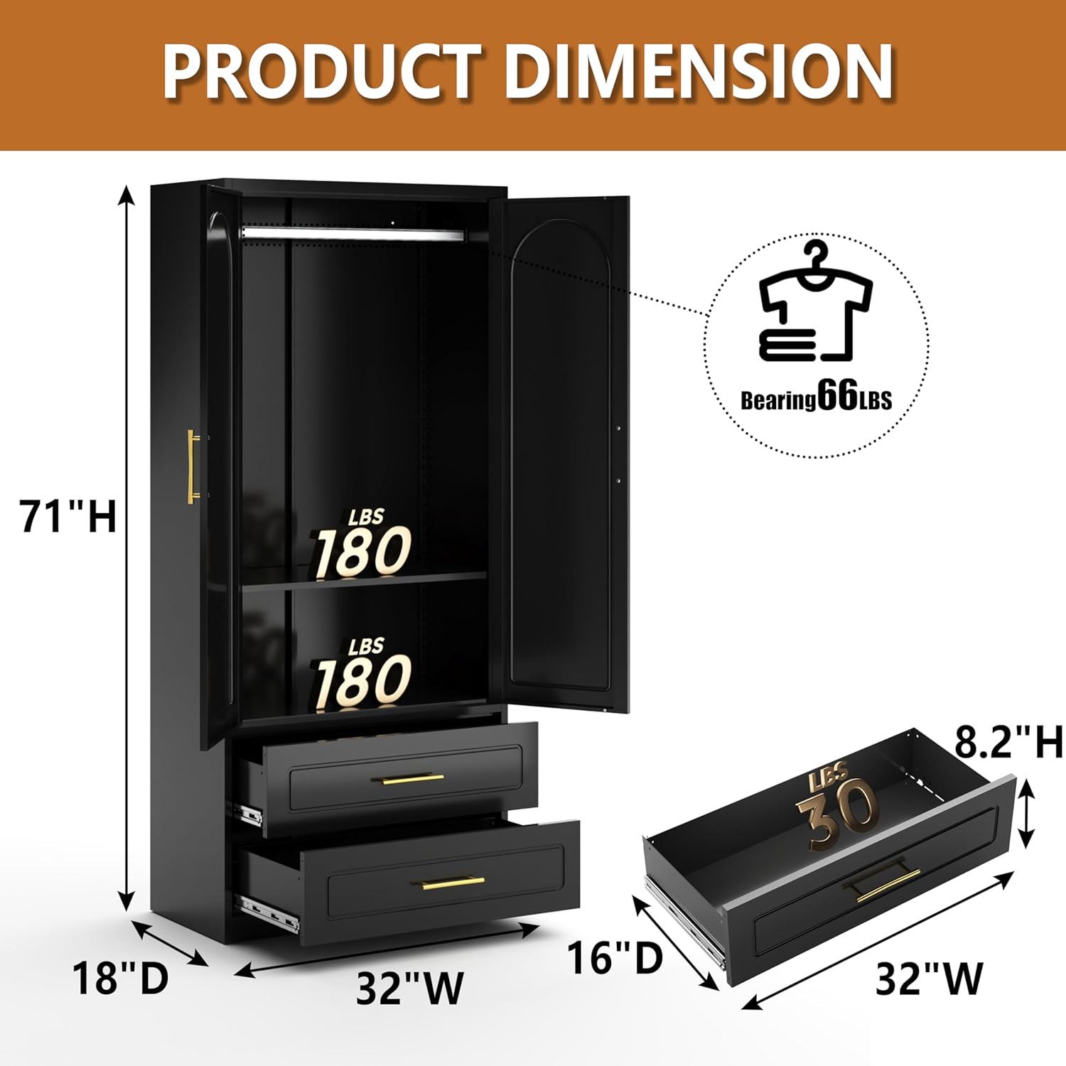 - [MULTIPLE STORAGE SPACES] With a stack area that can hold up to 180 LB, a hanging rod that supports 66 LBS and 2 drawers that supports 30LBS this wardrobe cabinet offers versatile storage solutions to keep your clothes, accessories, and other items neatly organized