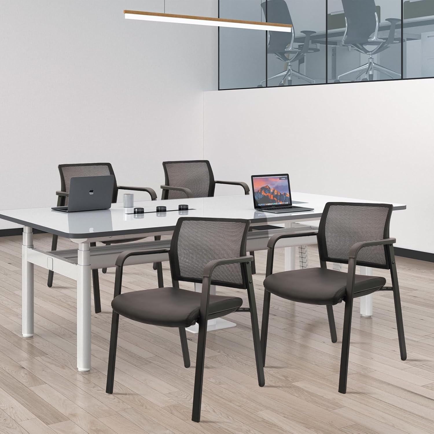 CLATINA Stackable Office Chair, Mesh Back Guest Chairs with Comfortable Leather Seat Arms Stacking Ergonomic Desk Chair No Wheels for Conference Waiting Reception School Stationary, Black, Set of 4
