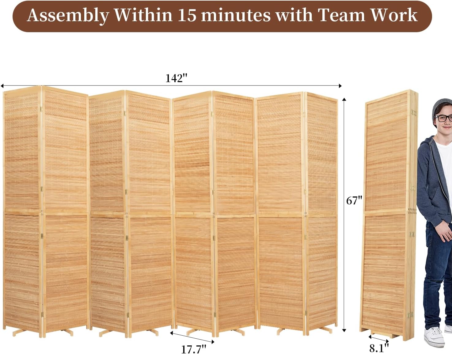 Bamboo Room Divider 8 Panel Wall Divider, 142'' W x 67'' H Folding Design with Extra Stable Base, 100% Bamboo Room Divider Screen for Room Separation, Chinese Room Partitions and Dividers Freestanding