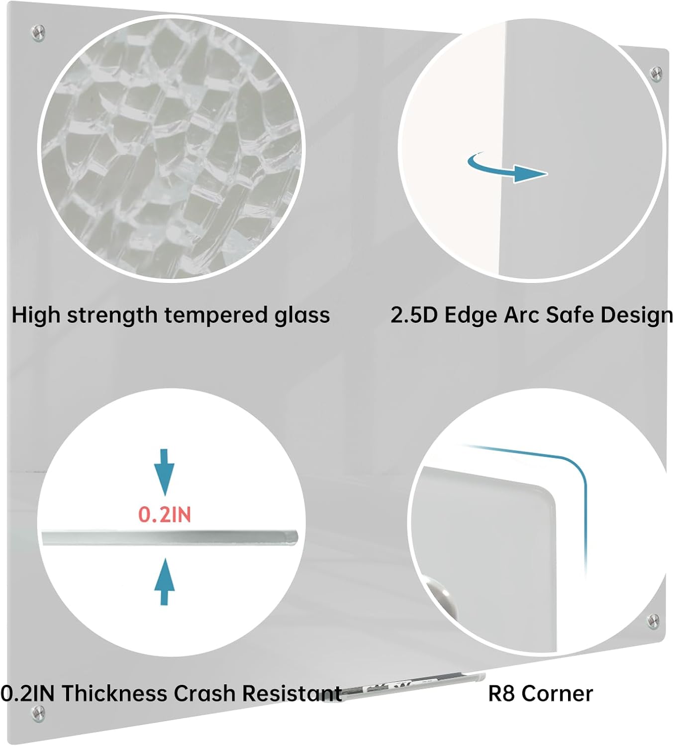 - Frameless Tempered Glass Design: Our glass whiteboard features a sleek frameless design that maximizes the writing area, allowing for unrestricted creativity. With a size of 48 * 36 inches, the smooth tempered glass surface ensures effortless writing, easy wiping, and no dust accumulation.