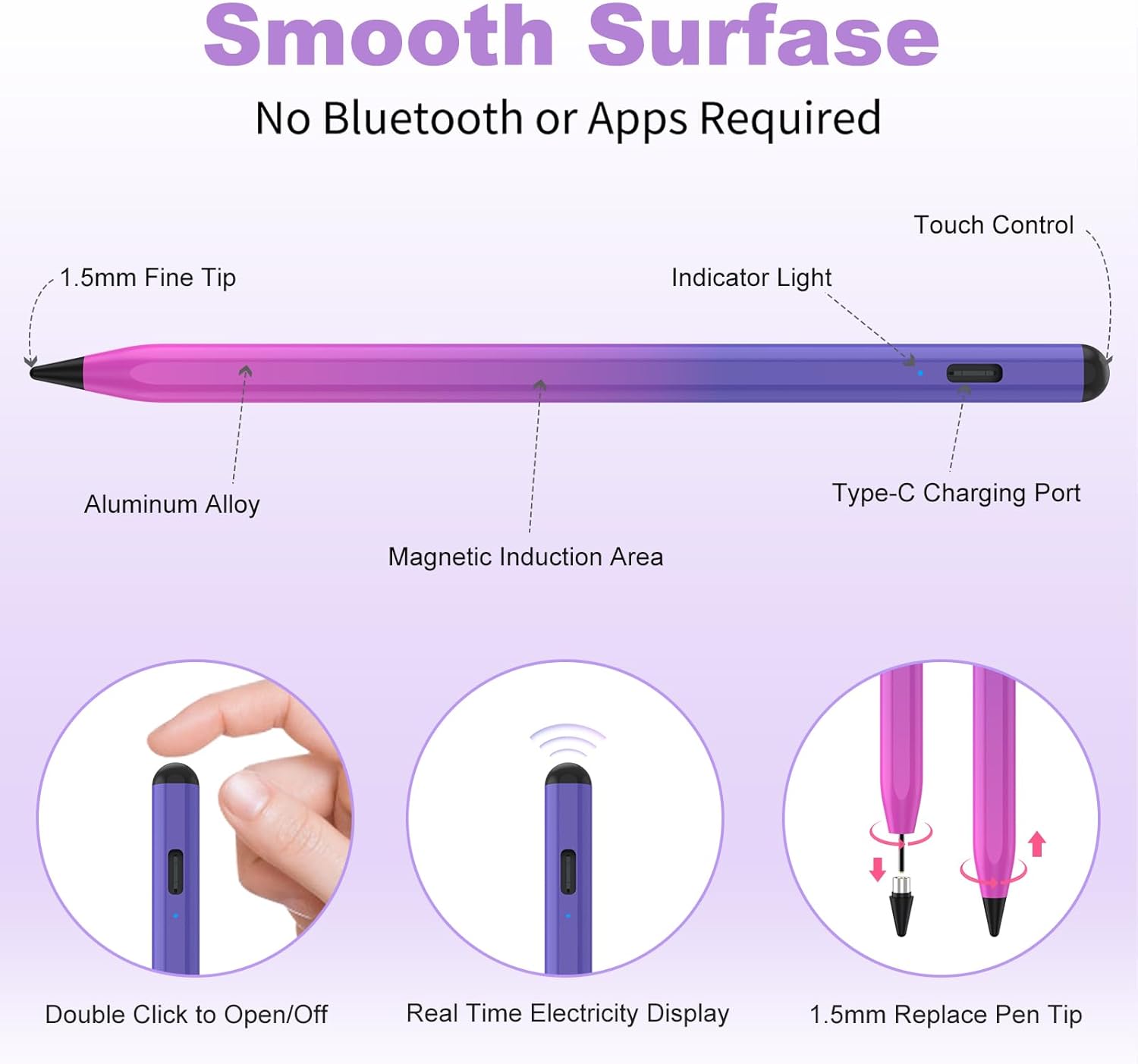 - Compatible Devices : Lenovo/HUAWEI/Vivo/Mi/Samsung and Other Tablets; Cell phone: iPhone, Android, HarmonyOS, and other system phone, This stylus pen doesn't need to connect to Bluetooth & APP. Double-touch the top of the stylus pen to turn on If it doesn't work, please follow step 1 or step 2 below: 1. Go to Settings > Bluetooth > Turn off Bluetooth 2. Go to Settings > Bluetooth > Apple Pencil > Tap > Forget This Device Before the first time to use the stylus pen, please charge fully with the included Type C charging cable, ✩ NOTE: This stylus pen not compatible for iPad & Microsoft tablets and windows systems Lenovo/HUAWEI/Vivo/Mi/Samsung and Other Tablets; Cell phone: iPhone, Android, HarmonyOS, and other system phone, This stylus pen doesn't need to connect to Bluetooth & APP. Double-touch th… See more