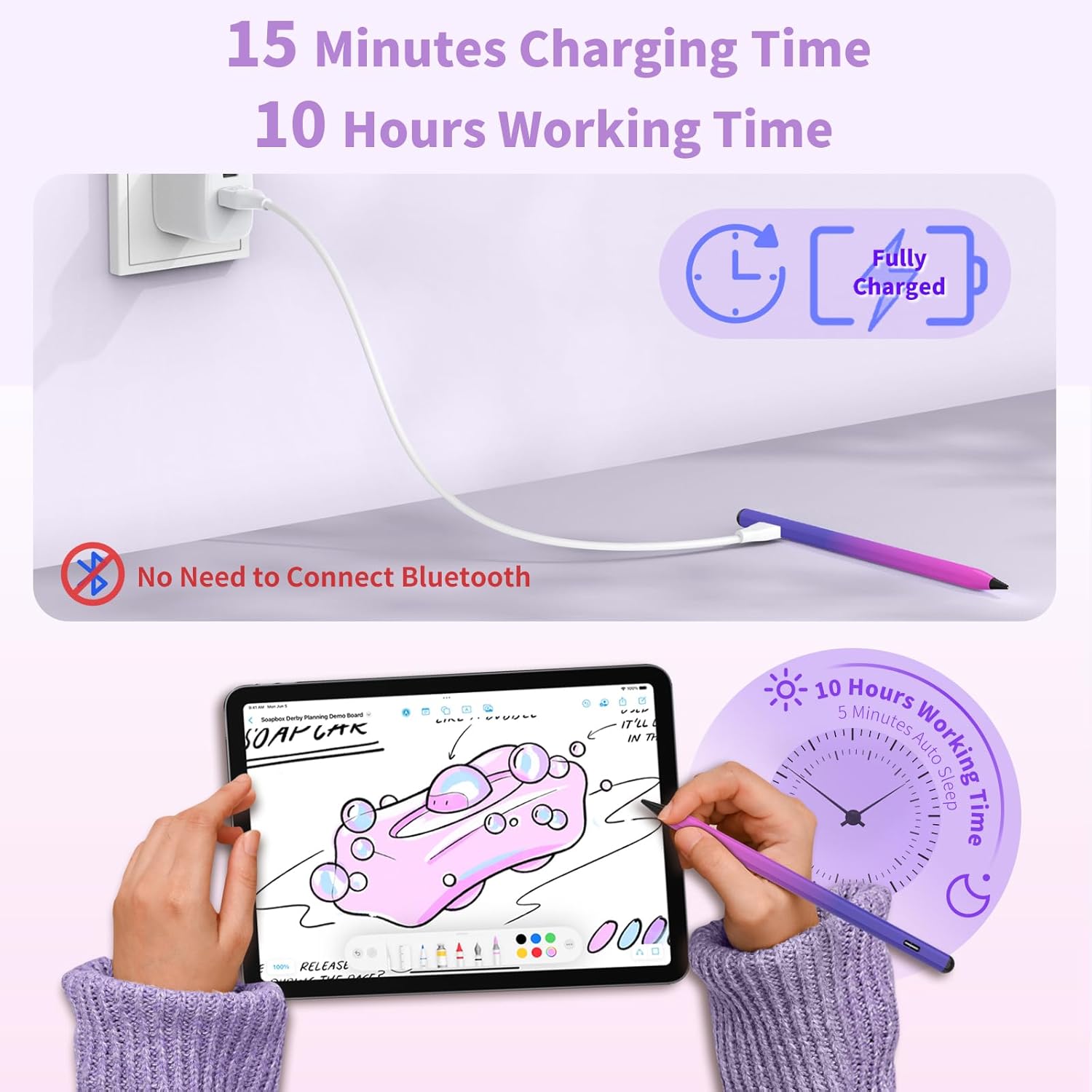 - ✅Fast Charging and Long Standby: This stylus pen support 10 hours of continuous use and 180 days long term standby for only 15 Minutes per charging. Don’t need to turn off it by hand, it will auto-fall asleep after idle for 5 minutes to save power