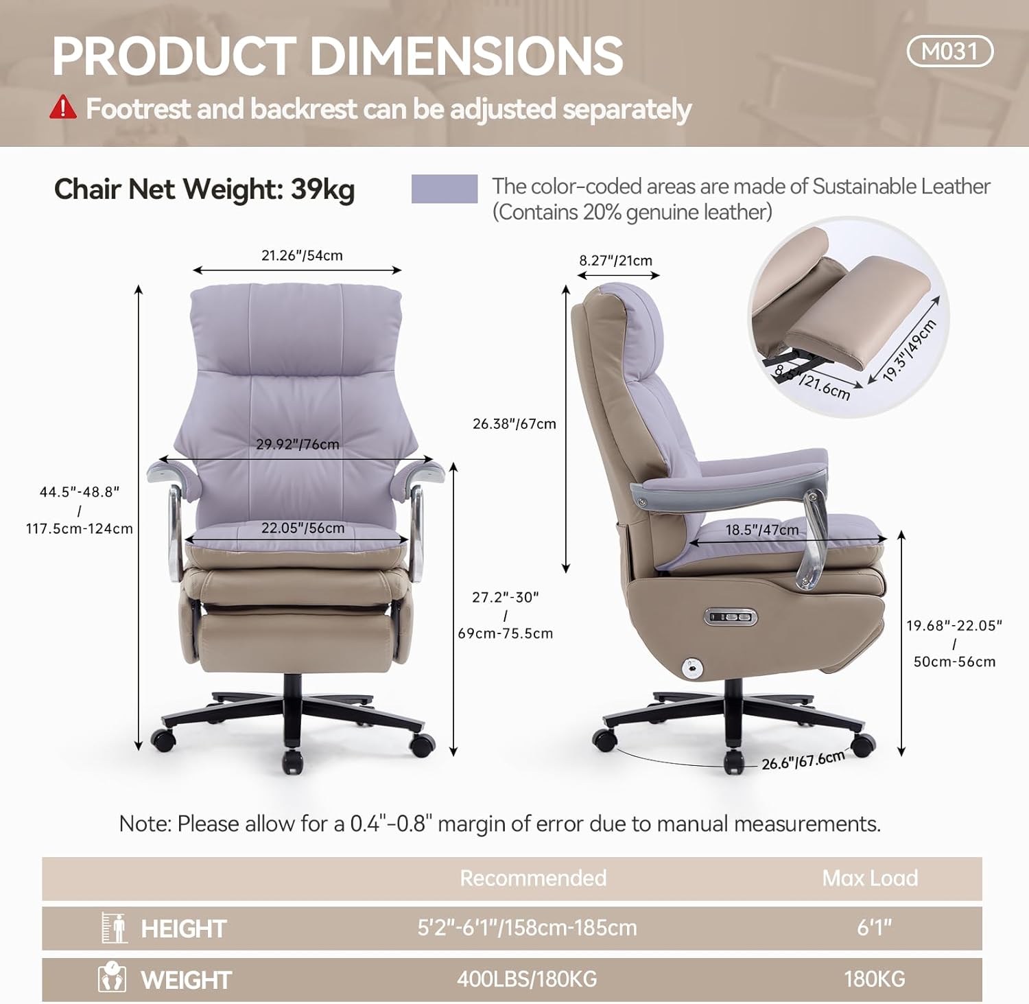 Executive Office Chair with Footrest,Sustainable Leather Electric Ergonomic Reclining Home Office Desk Chairs with Massage,Big and Tall Comfy Computer Chair with Wheels High Back 400LB,Khaki